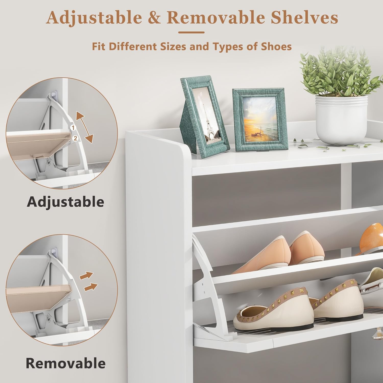 - FLIP DRAWERS SHOE CABINET: This slim shoe cabinet adopts the space-saving design of flip drawers, which are effortless to open and close. The shelf in the centre of the shoe cabinet can be easily adjusted and removed to store everything from flats and trainers to mid-calf boots. It's a great storage solution to eliminate cluttered piles of shoes, saving space in narrow aisles or entryways.