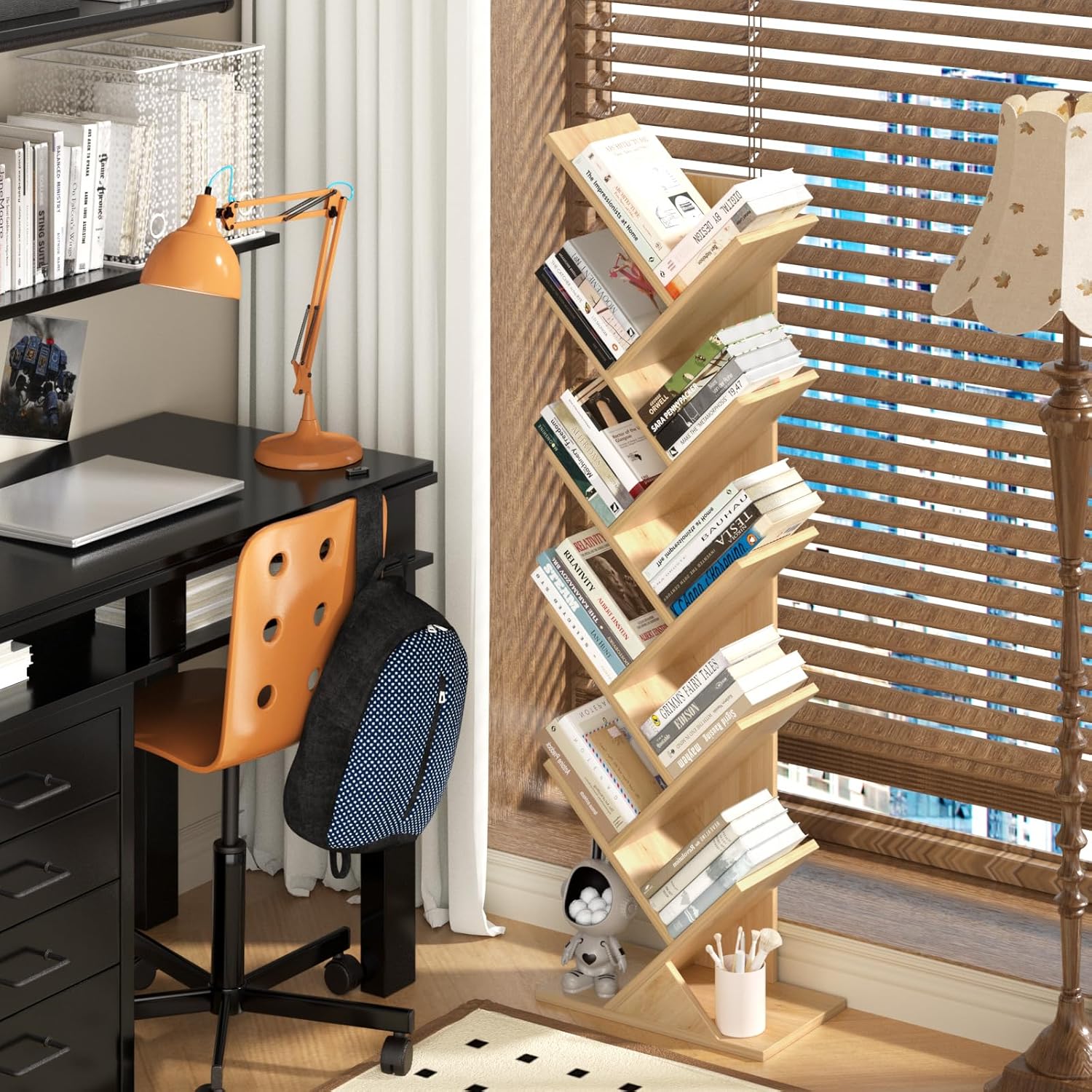 10 Tier Tree Book Shelf, Floor Standing Wood Bookshelf for Narrow Space, Storage Organizer Bookshelves for Books/CDs/Magazine, Bookcase with Shelves for Home Office, Living Room - Natural