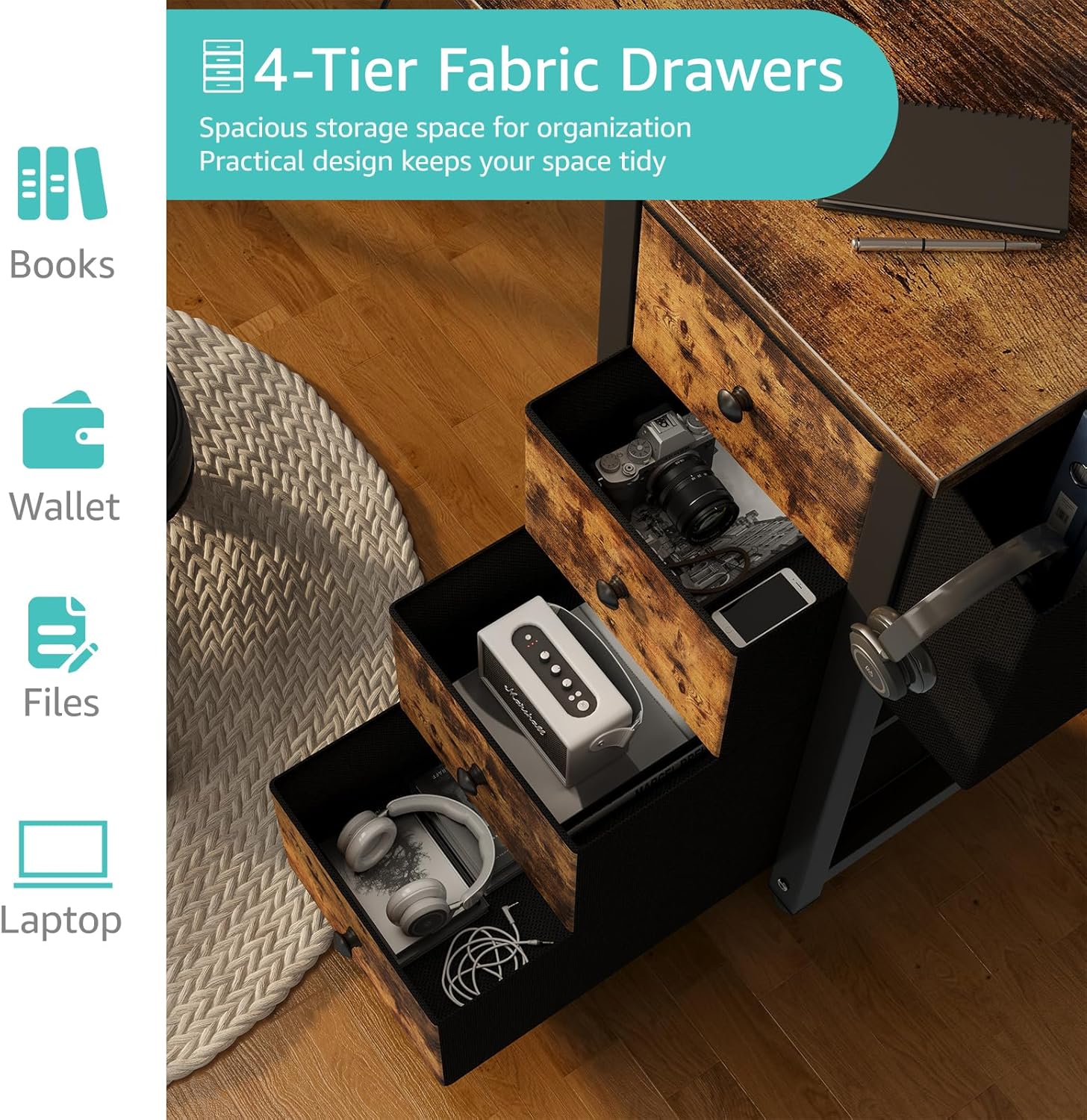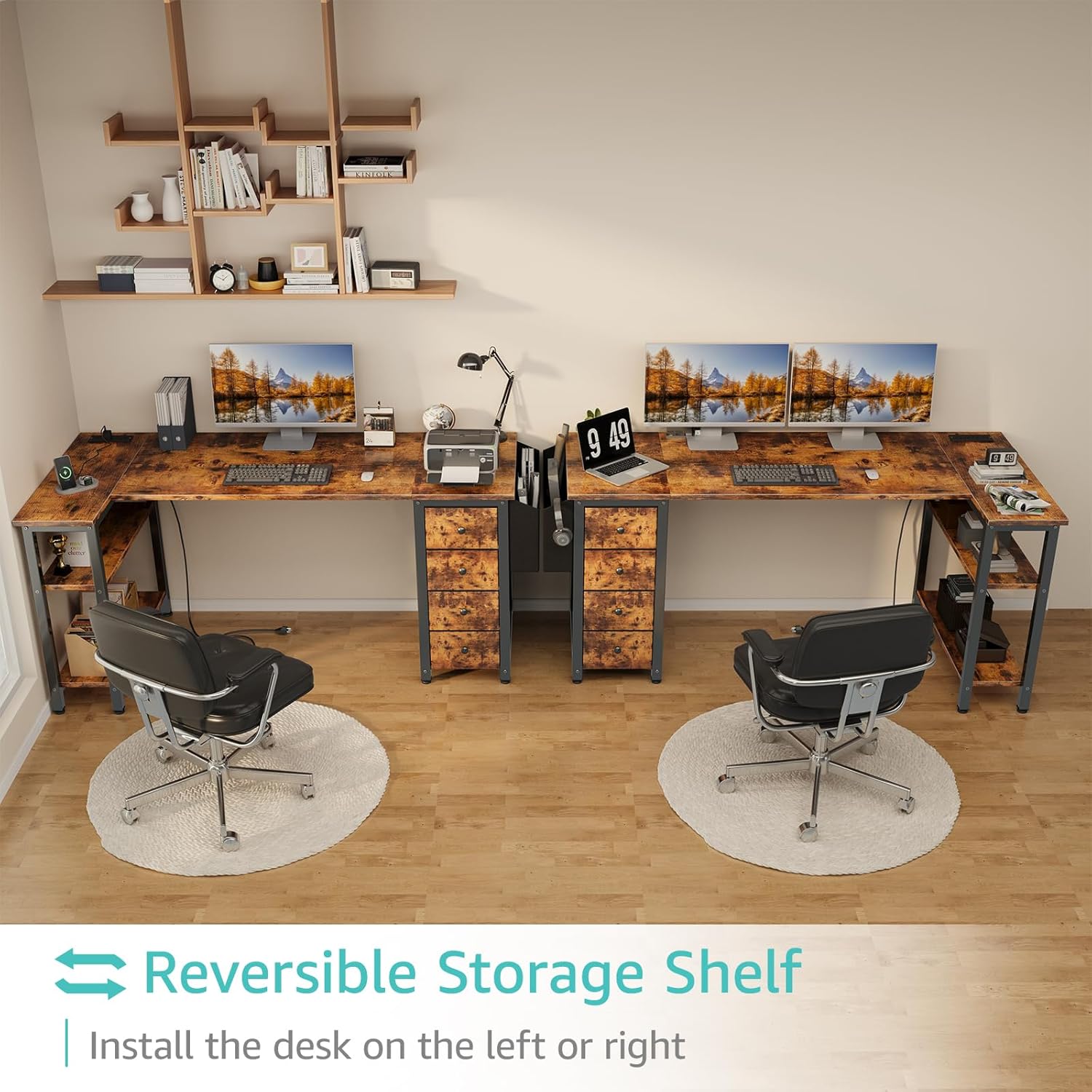 Lufeiya L Shaped Computer Desk with Drawers & Storage Shelves, 63 Inch Corner Desk with Power Outlet for Home Office Bedroom, L-Shaped Teen PC Gaming Desks with Fabric Drawer, Rustic Brown