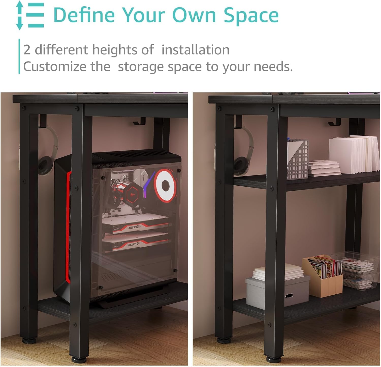 - Working Desk With Ample Storage Options: Computer desk with 2 storage shelves and 4 ππππ§ππ πΏπ§ππ¬ππ§π¨, you can try this two installation methods (left or right), and the shelves have two different heights of installation, you can customize the storage space to your needs. It also have 2 iron hooks, perfect for holding magazines, notebooks, bags or small electronics