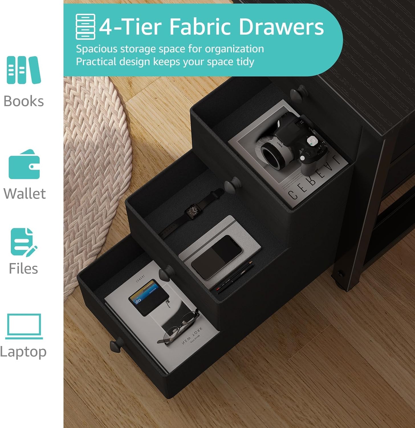Lufeiya Gaming Desk with 4 Fabric Drawers & Storage Shelves, 55 inch Computer Writing Work Study Desk for Home Office Bedroom, Modern Simple Student PC Desks Table, Black