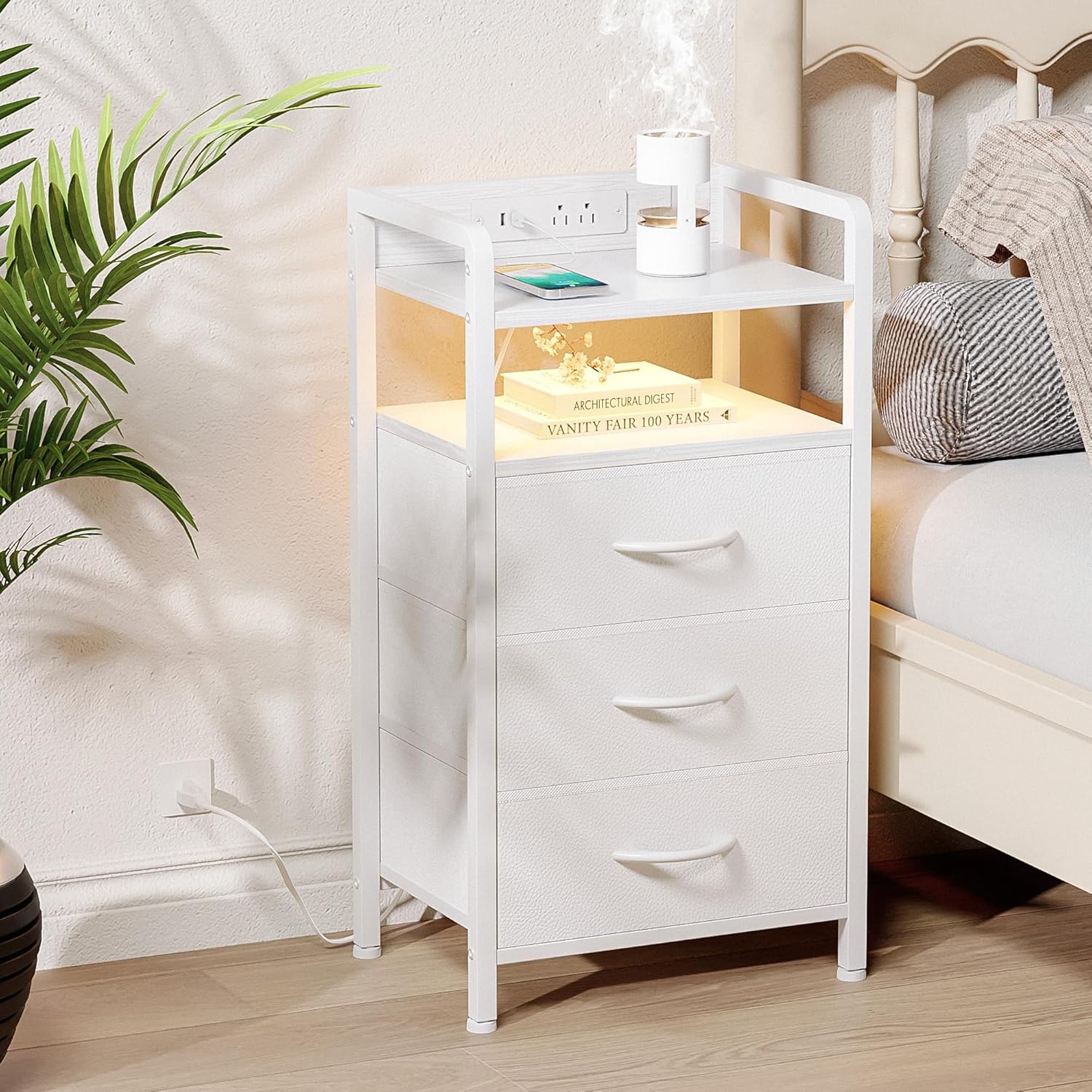Night Stand Bedside Charger Bedroom - Nightstand with Charging Station, Bed Side Table with LED Light Strip, End Table with U-S-B Ports & AC Outlets, Storage Shelf & 3 Fabric Drawers, White