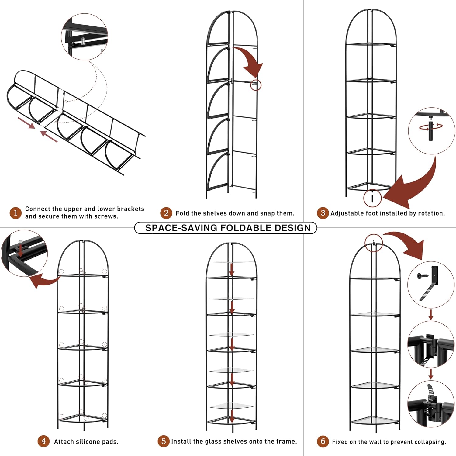 Crofy Foldable 5 Tier Corner Shelf, Metal Corner Plant Stand with Black Frame and Transparent Shelves, Corner Display Rack Multipurpose Shelving Unit for Living Room, Bedroom, Bathroom