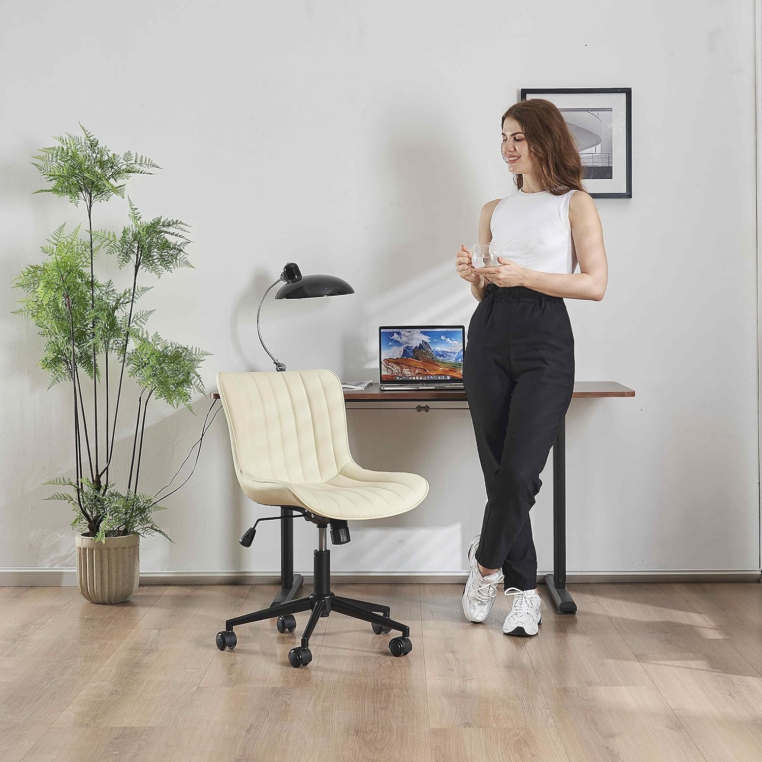 YOUNIKE Beige Home Office Desk Chair with Wheels Swivel Comfy Armless Vanity Chair with Back Modern Leather Upholstered Rolling Task Chair Small Cute Drafting Sewing Chair No Arms Adjustable