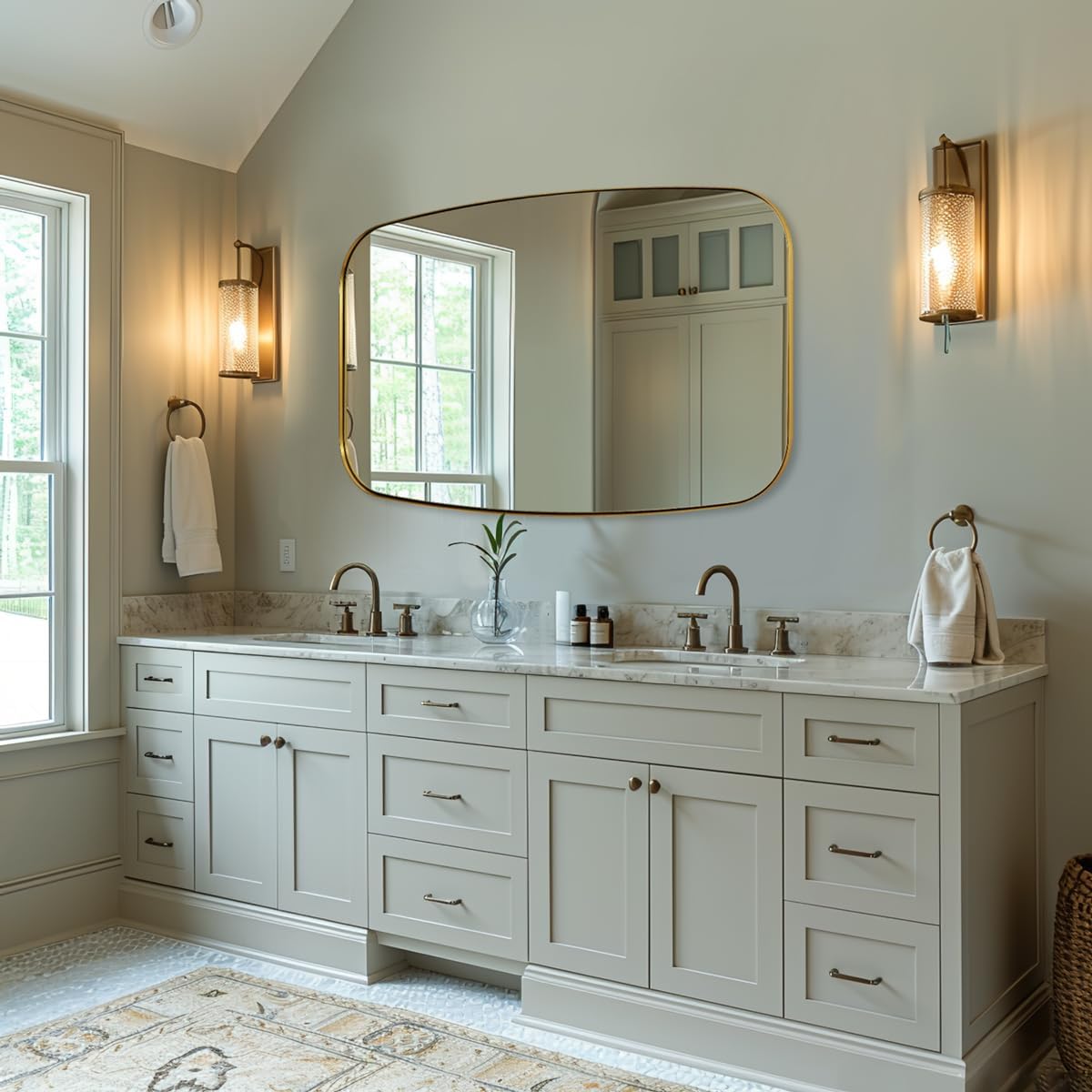 - Excellent Performance: A sleek, modern stainless steel metal frame surrounds a unique oblong mirror; sets it apart from traditional oval or rectangular mirrors; brushed gold finish complements your bathroom; adds light and space to the room