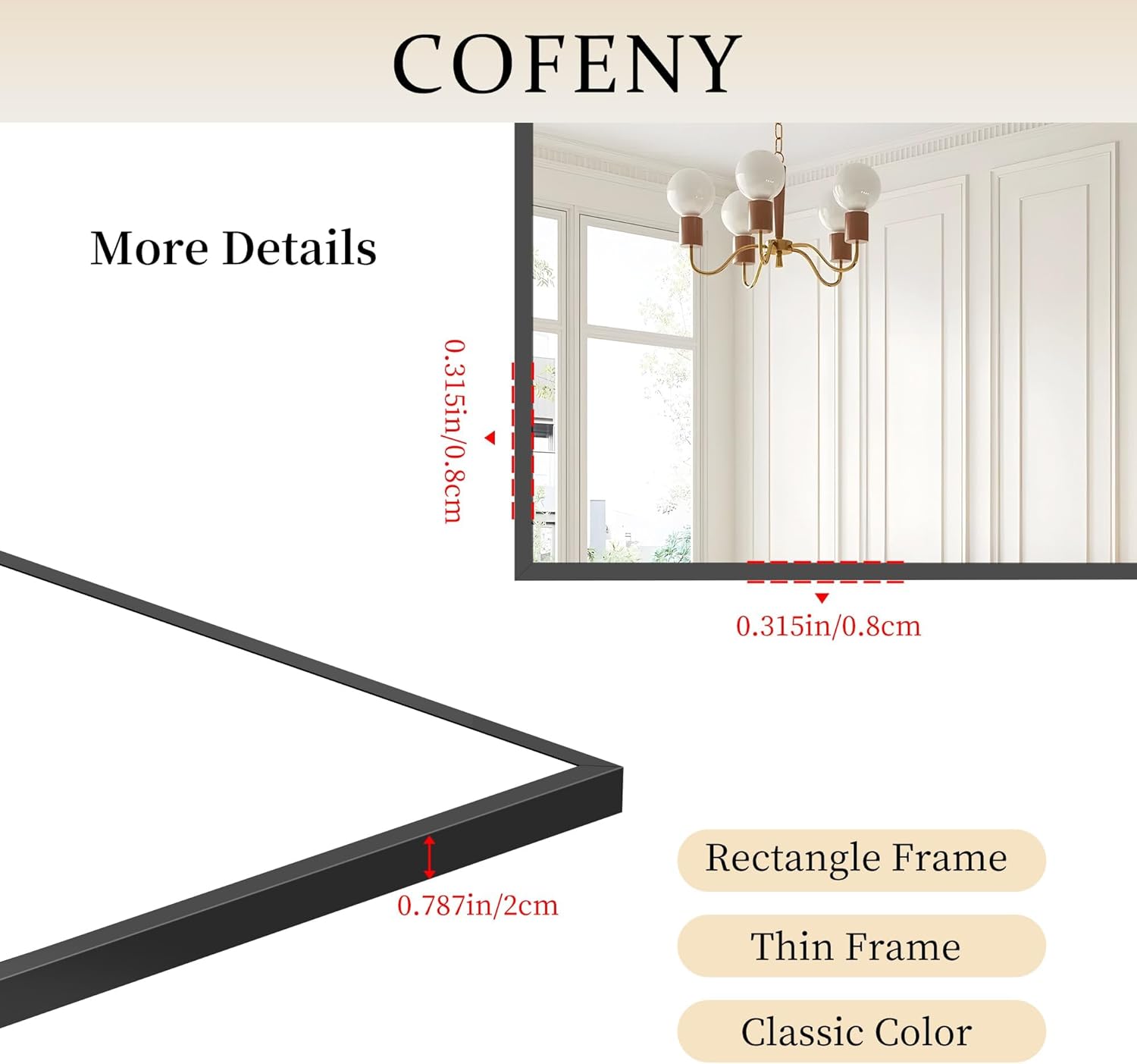 - Note: COFENY mirror supports both horizontal and vertical mounting. Mirror installation requires the use of two sides of the mounting holes, refer to the installation pictures (single side frame can not withstand the weight of the mirror)