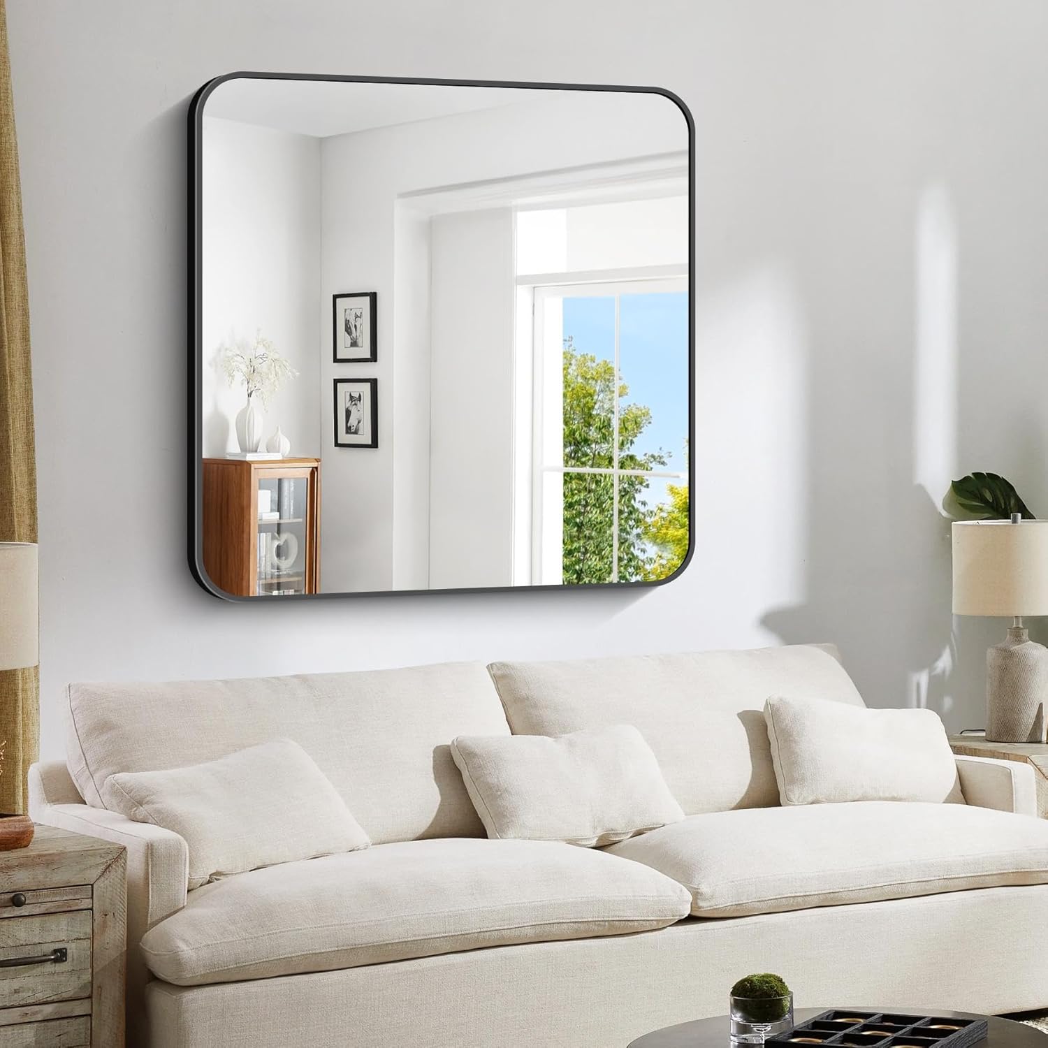 Bathroom Mirror, 42x42 inch Black Square Wall Mirror, Rounded Corner Aluminum Metal Frame Vanity Mirror, Large Wall Mounted Mirrors for Over Sink Bedroom Living Room Entryway