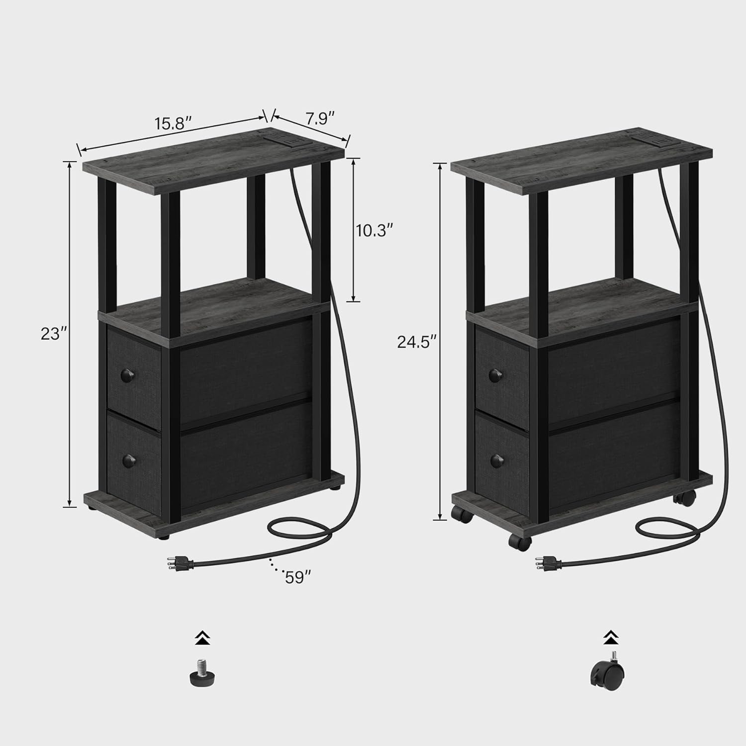 TUTOTAK Small Narrow End Tables, Side Tables with 2 Fabric Drawers, Set of 2, Bedside Tables with Charging Station for Small Spaces, Slim Nightstands with USB Ports and Wheels, TB01BY053