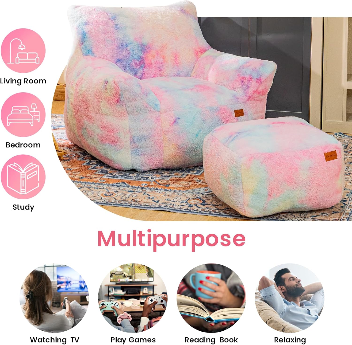 Bean Bag Chair, Sherpa Accent Beanbag Chair and Ottoman Set, Fur Faux BeanBag Chair with Memory Foam Filled, Lazy Sofa Comfy Cozy BeanBag Chair for Dorm, Apartment, Living Room (Colorful)