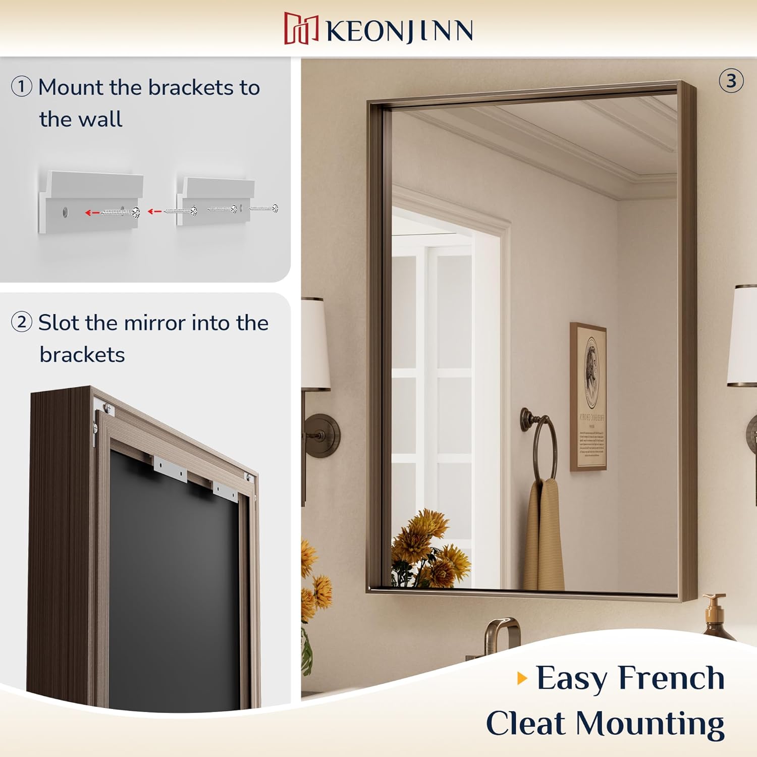 - 【Modern Design】 The rectangular wall mirror has the most chic brushed bronze finish, coming with a 1.57" depth Aluminum alloy frame. Square corner mirror features the minimalist style and able to add texture to your space. Give an instant premium upgrade to any room with Keonjinn brushed bronze metal framed mirror.