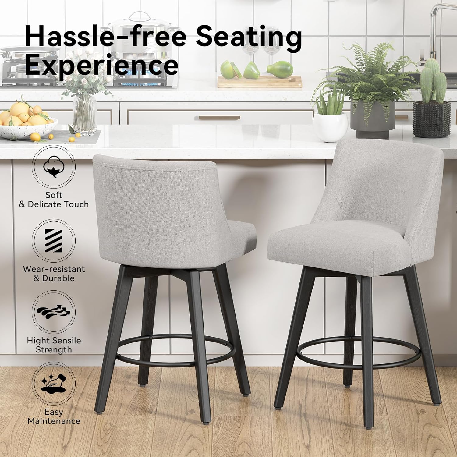 Counter Height Swivel Bar Stools Set of 2, 26 Inch Bar Stools with Footrest, Linen Fabric Upholstered Barstools with Back and Solid Wood Legs for Kitchen Island, Dining Room,Pub,Light Grey