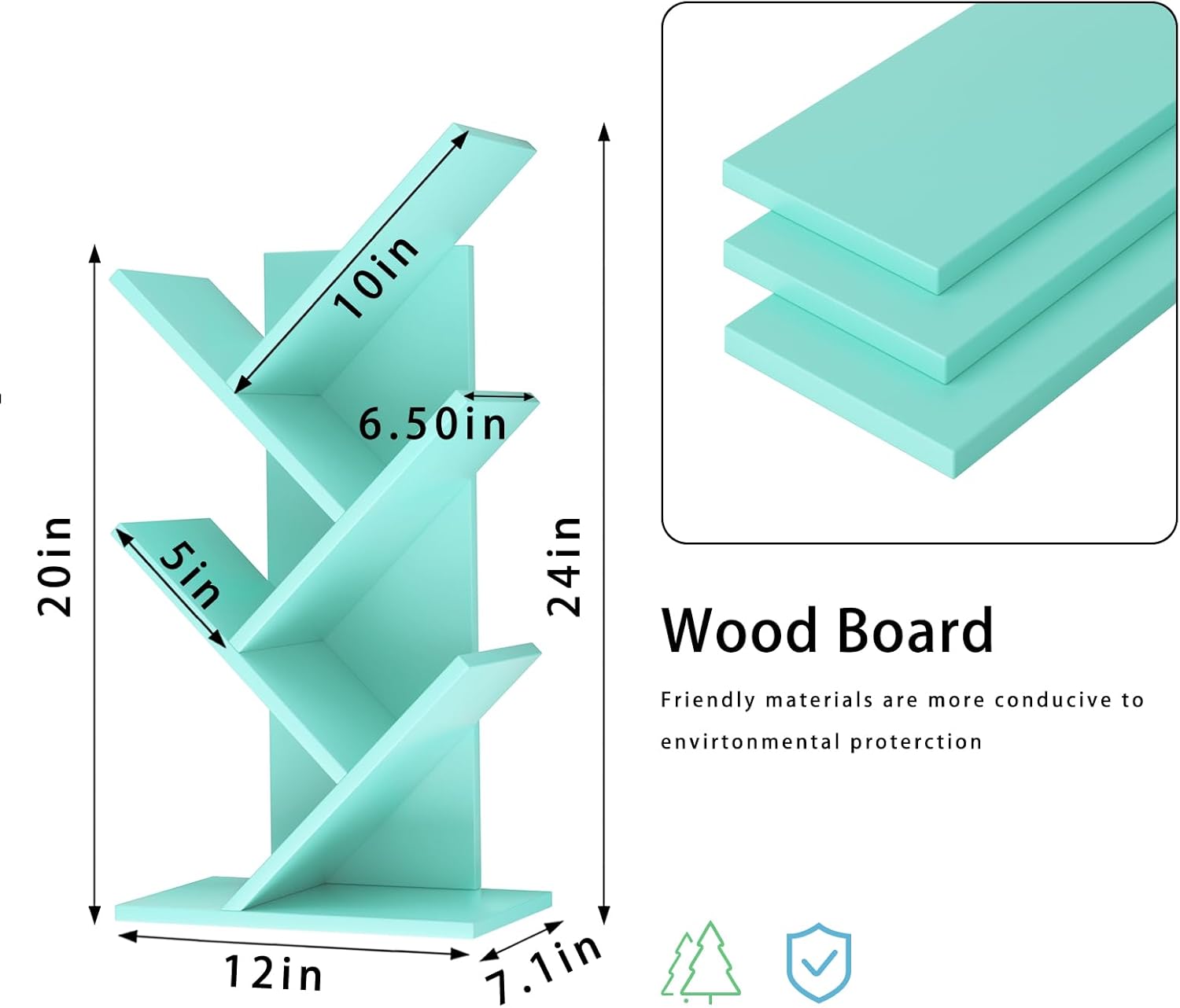 - Small Size Bookshelf:The size of the tree bookshelf is 7.1"D x 12"W x 24"H. Despite its compact size, this tabletop shelves can efficiently hold books, documents and other items, perfectly adapted to the limited space of the home or office, and make full use of its powerful storage capacity.
