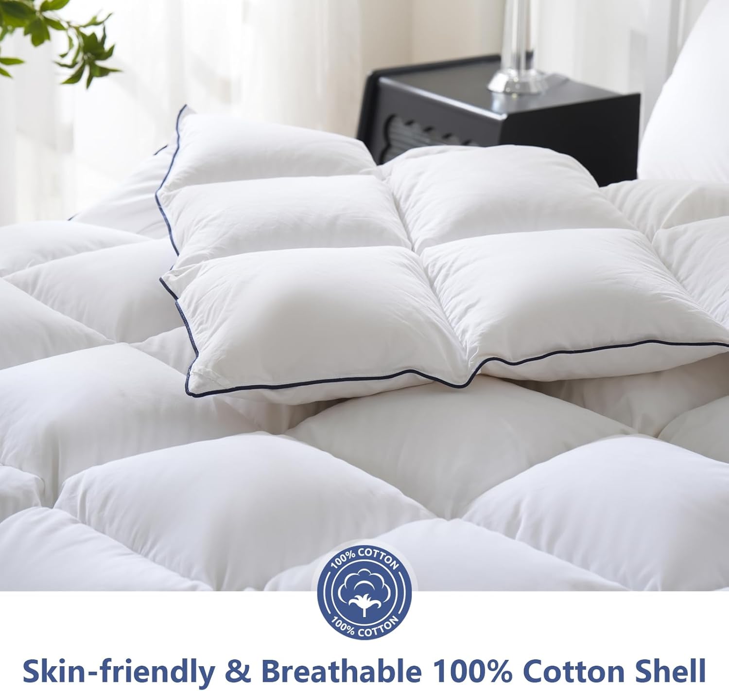 - 【Luxurious Feather Comforter】Downcool white oversized king feather comforter (116"x98") is crafted with a premium blend of high fluffy waterfowl feathers & feather fibers, offering a light and airy feel, providing the perfect balance of warmth and comfort. The luxurious hotel style bedding comforters will bring you a super cozy sleeping experience.