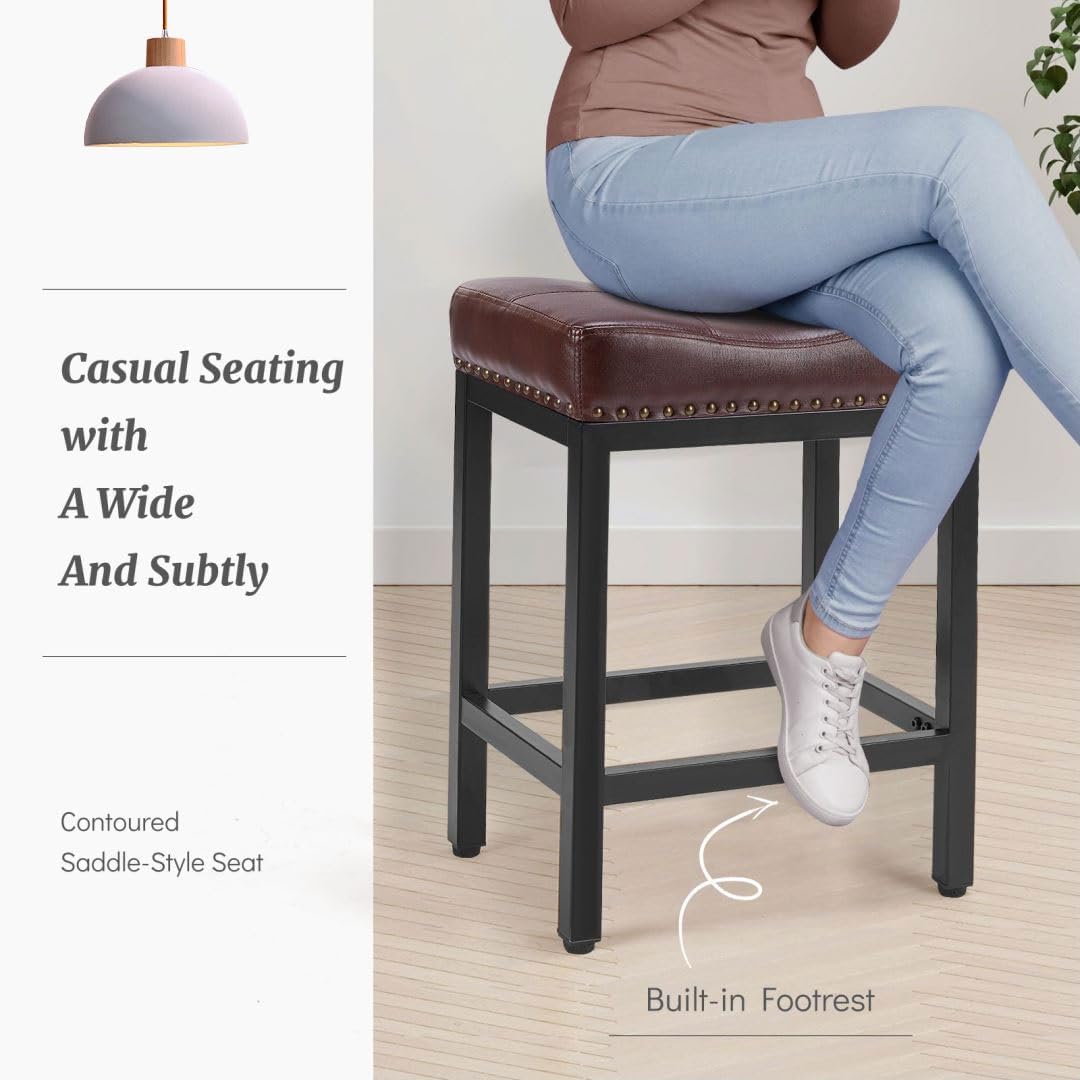 Counter Stools Set of 2 Upholstered Counter Height Bar Stools with Padded Seats and Metal Base, Leather Saddle Stool for Modern Kitchen Island, 22.4-Inch, Brown