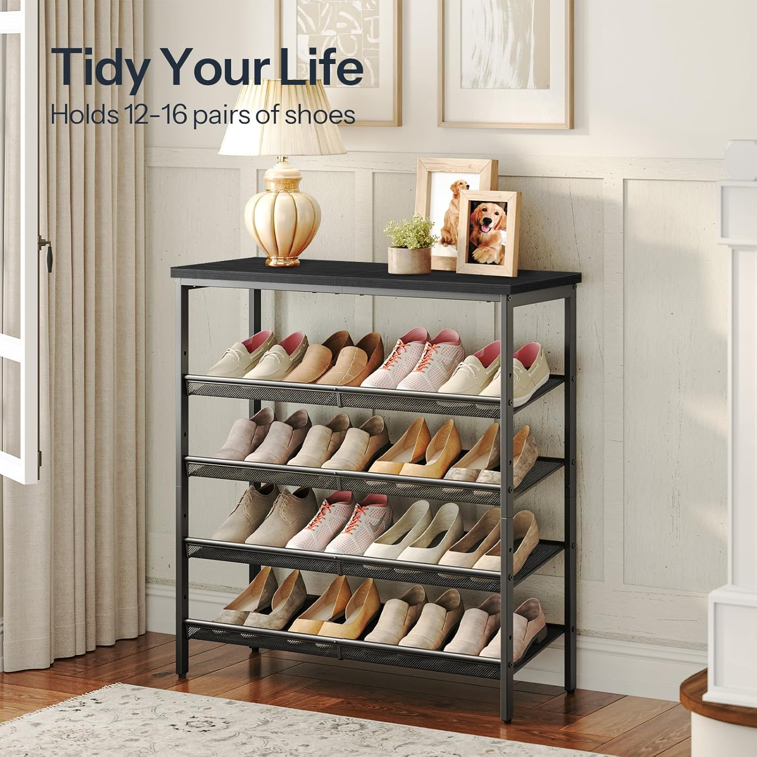 HOOBRO Shoe Rack for Entryway, 5-Tier Organizer with Adjustable Mesh Shelves, 16-20 Pairs, Spacious Floor Mount, Metal, Industrial, Closet Shoe Shelf, Black BB12XJ01