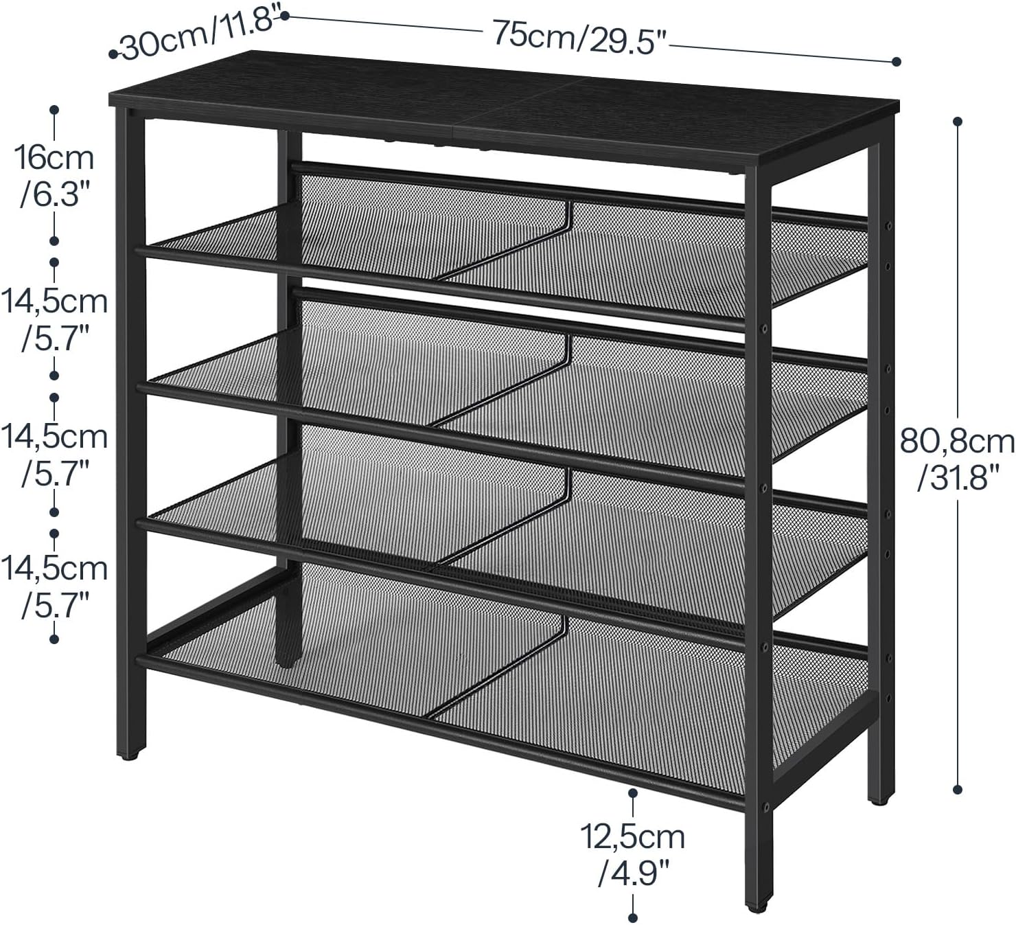 - Flexible Tilting and Leveling: Besides a spacious top, this shoe rack has metal mesh shelves to be tilted or leveled as per your preference, catering to diverse storage needs. How to store heels or tall boots? Removable design helps you