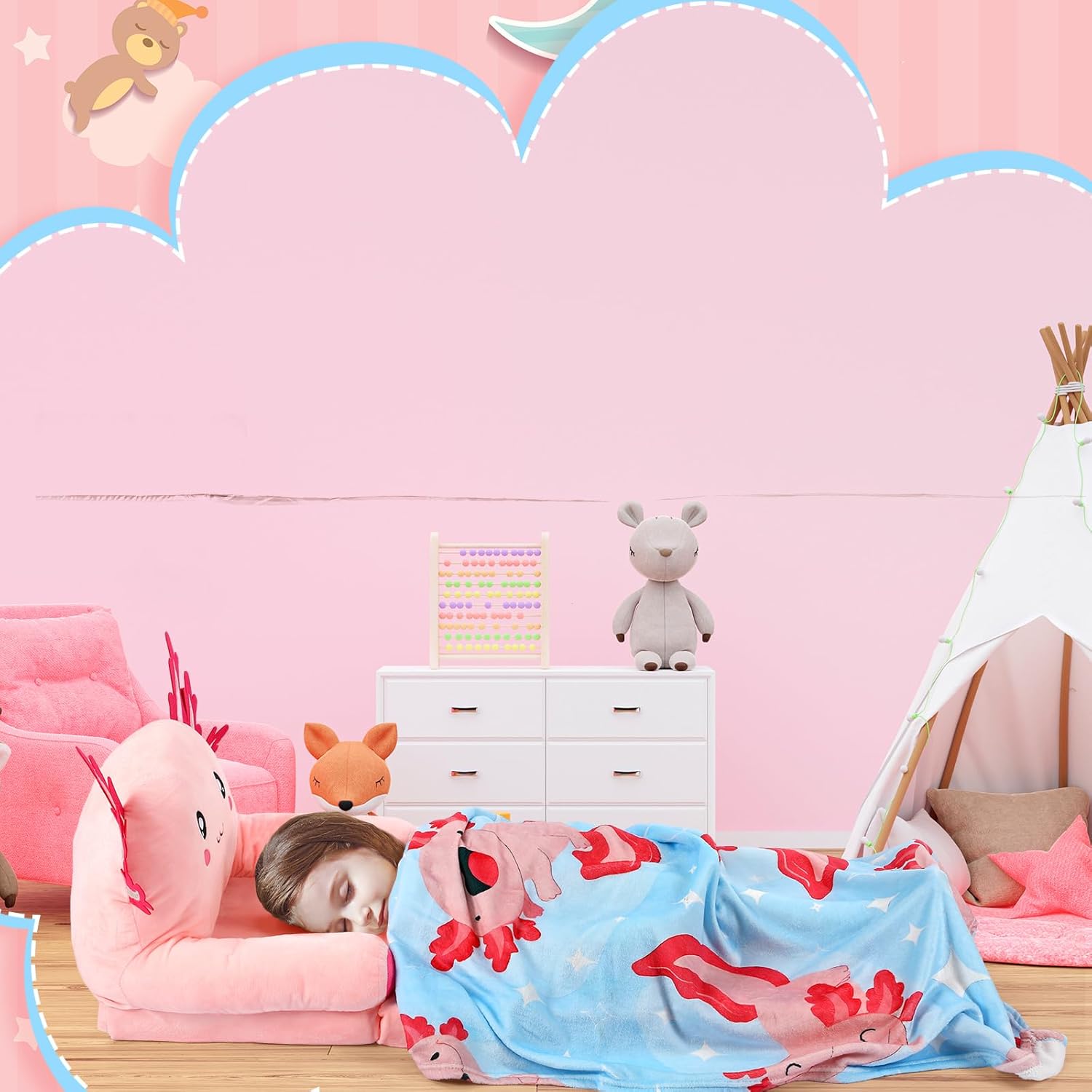 Axolotl Kids Couch Fold out 2-in-1 Toddler Sofa Fold out with Blanket, Soft Toddler Chair Comfy for Boy Girl Baby, Convertible Sofa to Lounger for Napping Reading Playing Christmas, Light Pink