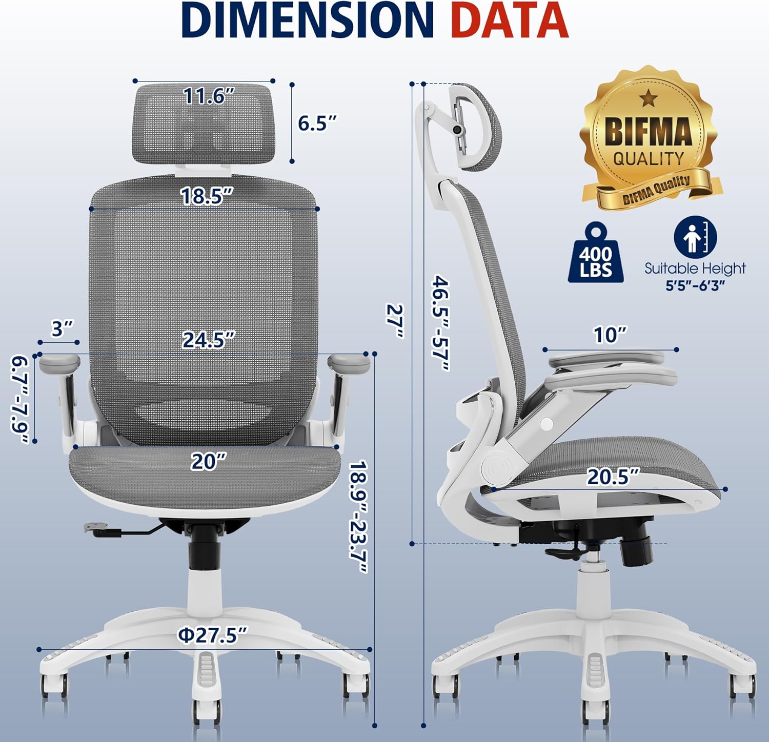 - 【WHITE OFFICE CHAIR】-The GABRYLLY high back red office chair has white backrest frame and silver back decorative cover, nice-looking and comfortable. Breathable mesh seat and large 27.5'' base bring coolness and stability. With flexible flip-up arms and high backrest, it fits users from 5'5" to 6'3".
