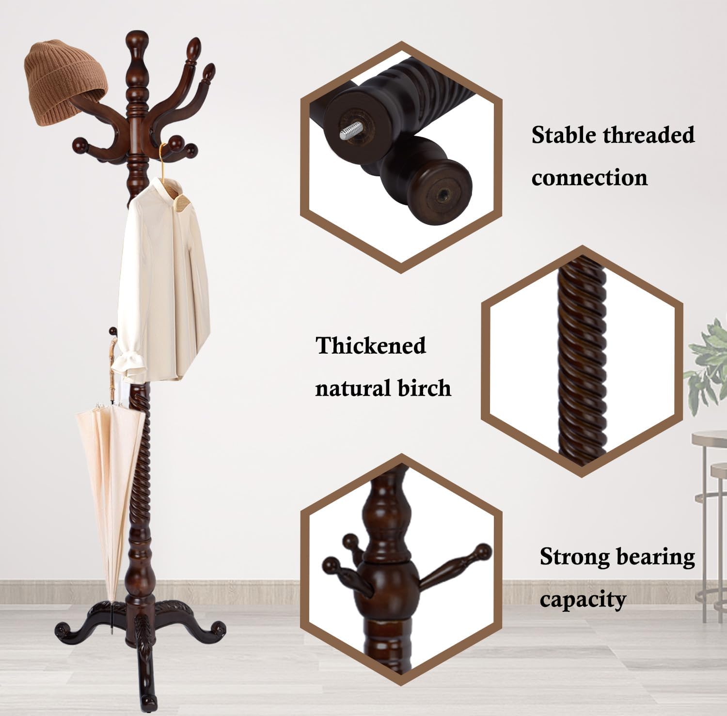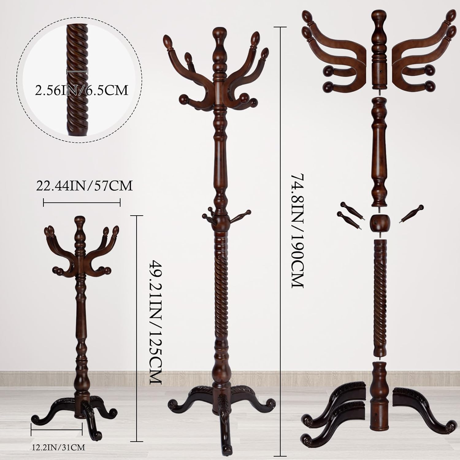 - 【Wider Application】The wooden coat tree is designed in a vintage style, with a simple structure and comprehensive functions. The coat rack can be placed in the hallway, living room, bedroom, office, and any corner you need. The wooden coat tree stand adopts an embedded screw design and is connected to the main pole, and the full-tooth screw is connected to the chassis. Equipped with installation tools and instructions, you can easily complete the installation.