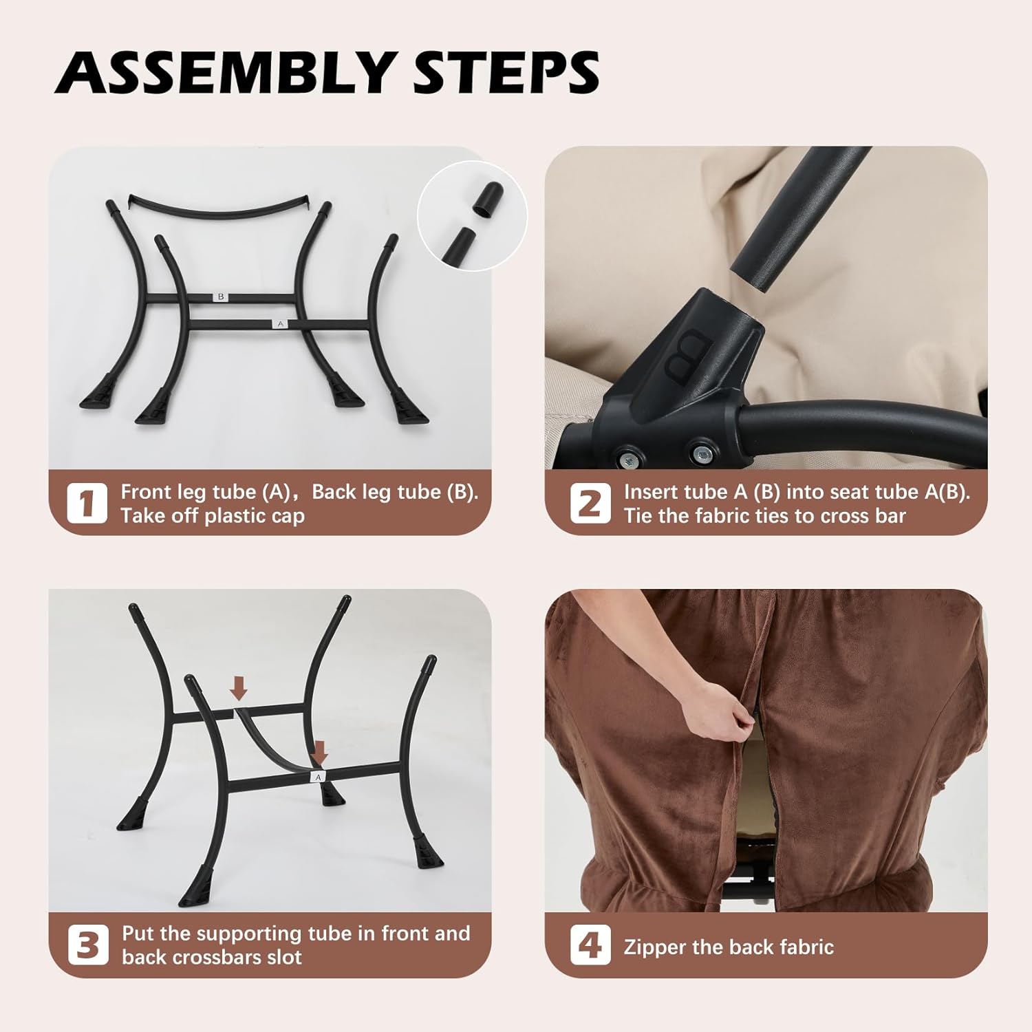 - Easy to Assemble:The chair is equipped with illustrations, making it very easy to install. Simply locate the AB tube and corresponding insertion port, and then connect the elastic connecting strap and fixed tube to complete the installation. The entire installation process takes less than five minutes. The chair legs also have a triangle protective cover design, which stabilizes the chair and prevents it from sliding, while protecting the floor from damage