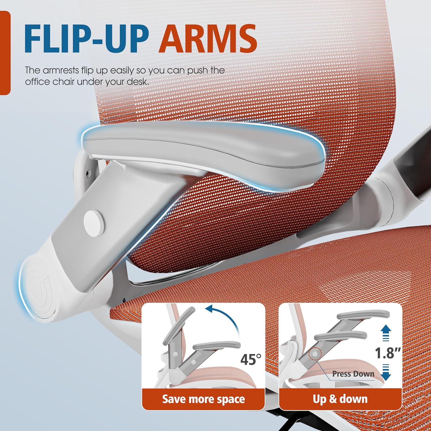 - 【ADJUSTABLE FLIP-UP ARMS】-If you want to make the most of the space under the table or choose a home desk chair for a small space/bedroom, this is the office chair for you! The GABRYLLY ergonomic office mesh chairs' armrest can be folded up(45°) and be adjusted the arms' height(1.8'').