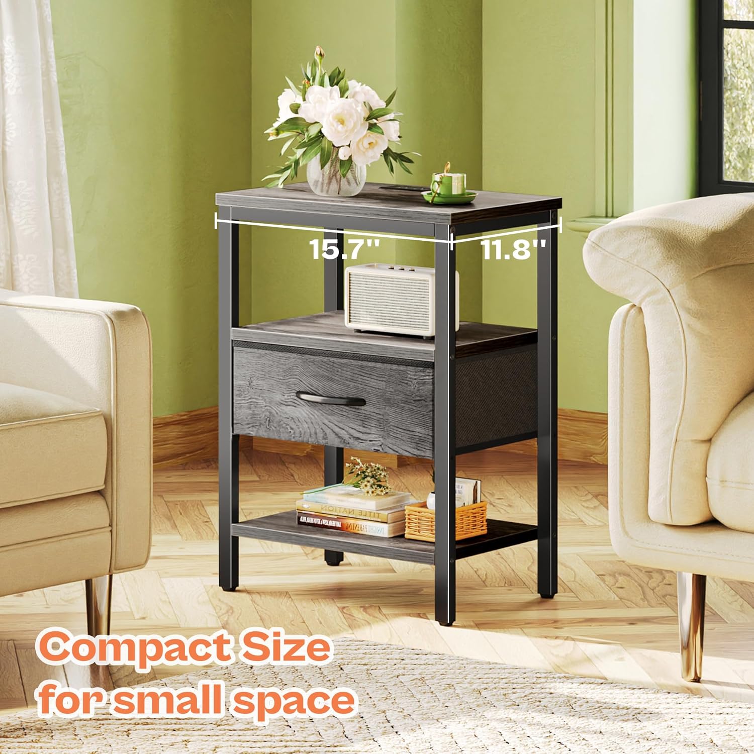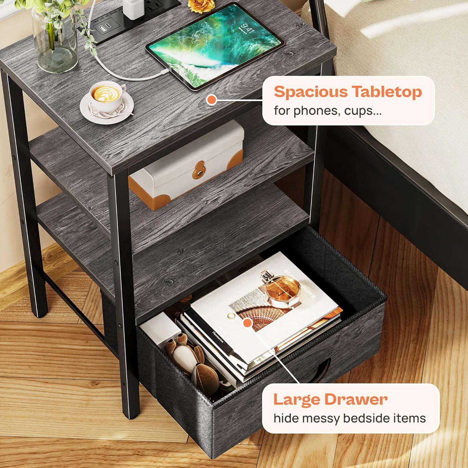 - 【Go for a Long Time】: Grey shelves, black metal frame combines grey fabric drawer, making it a timeless classic. Sturdy P2 particle board, robust metal frame, and durable fabric drawer, all these work excellently to give this side table with charging station strong support