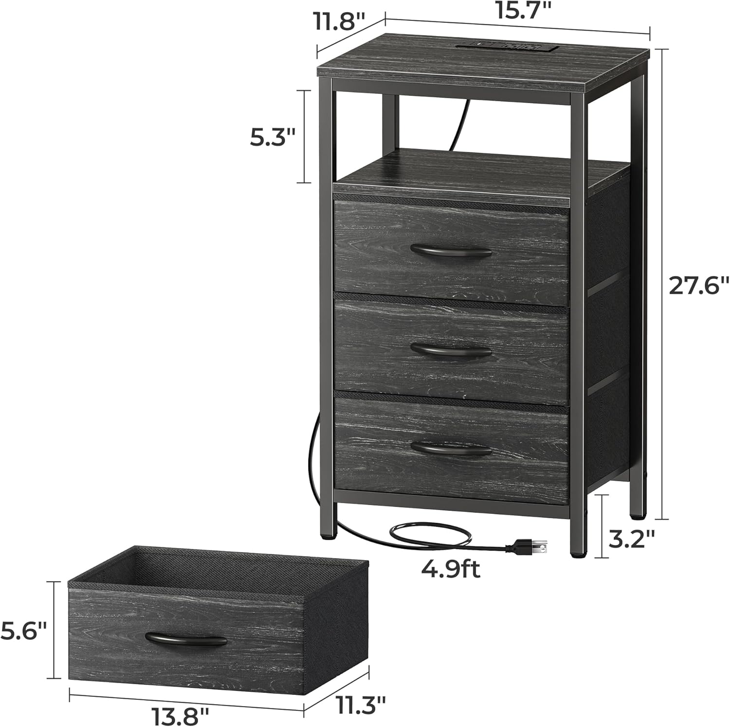 Huuger Nightstand with Charging Station, 27.6 Inch End Table Bedside Table with USB Ports and Outlets, Night Stand for Bedroom, Fabric Drawers, Charcoal Black Wood Grain Print