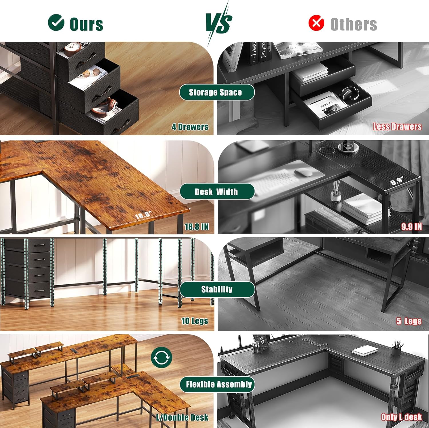- 2 in 1 Computer Desk: The study desk can be installed in an L-shape or long, depending on your requirements. Drawer placement can be switched as well. This home office desk can be used as a wark desk, study table or game table.