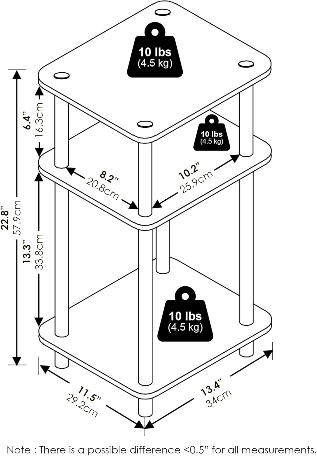 - Three shelves provide generous space to store your essentials, from books, and magazines to decorative items. Each shelf holds up to 15 lbs.