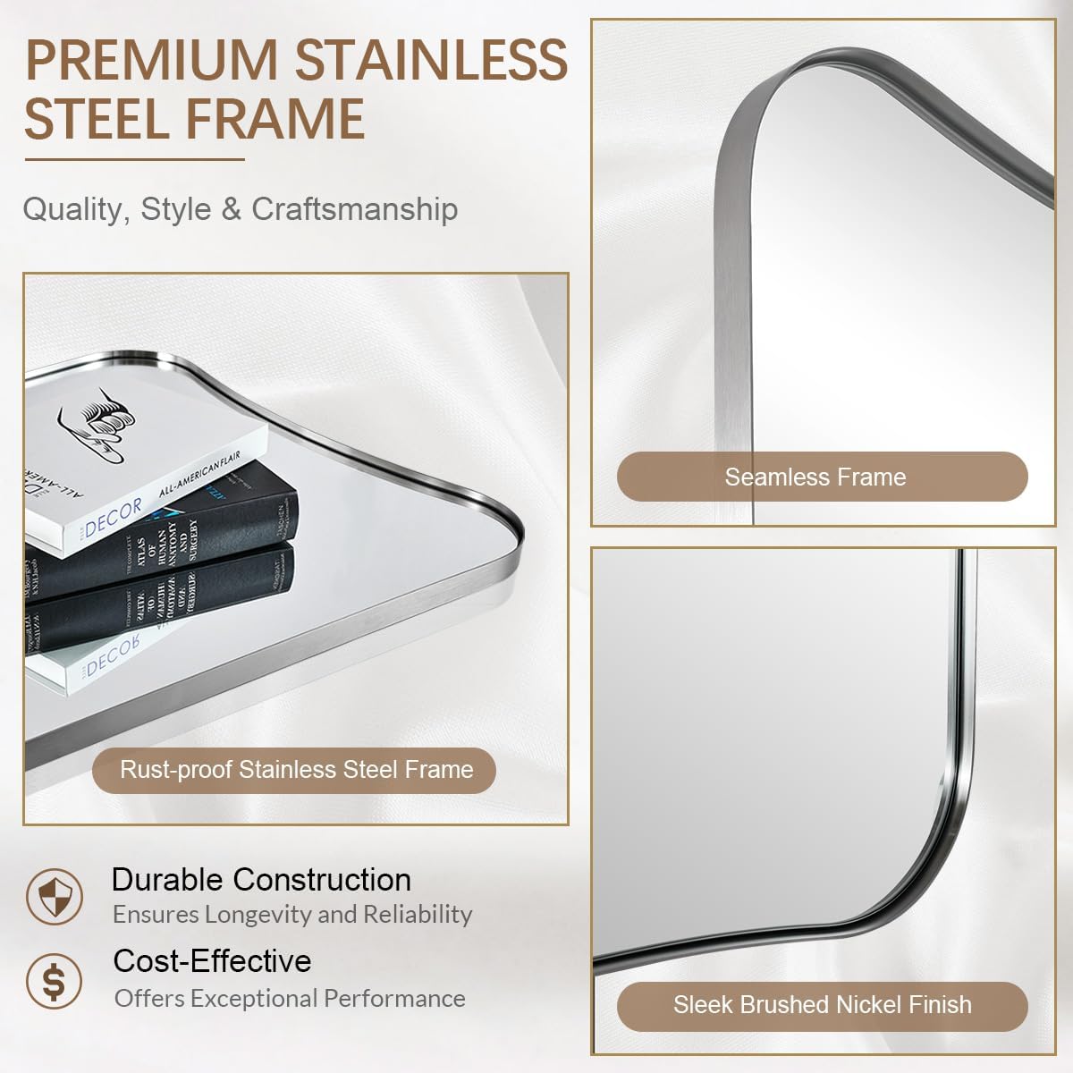 - 【High-Definition Clarity】: This brushed nickel framed mirror features a crystal-clear reflection using high-quality silver glass, offering true-to-life images without distortion. The robust construction of our modern irregular wall mirror ensures its longevity, while the easy-to-clean surface keeps your reflection pristine