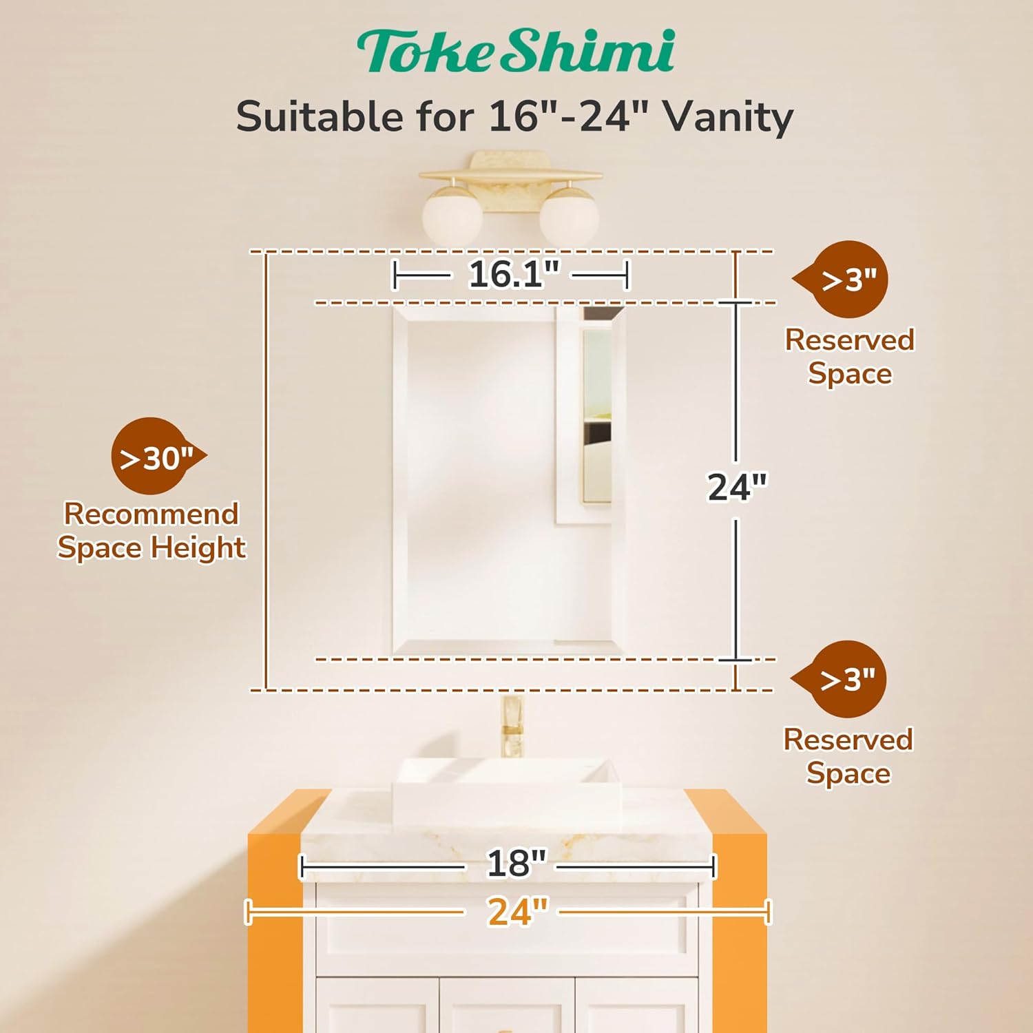 TokeShimi 16x24 Beveled Mirror Bathroom Rectangle, Bathroom Vanity Mirror Frameless with 1" Beveled Edge, Shatterproof Modern Decorative Wall Mirrored for Living Room, Entryway, Restroom