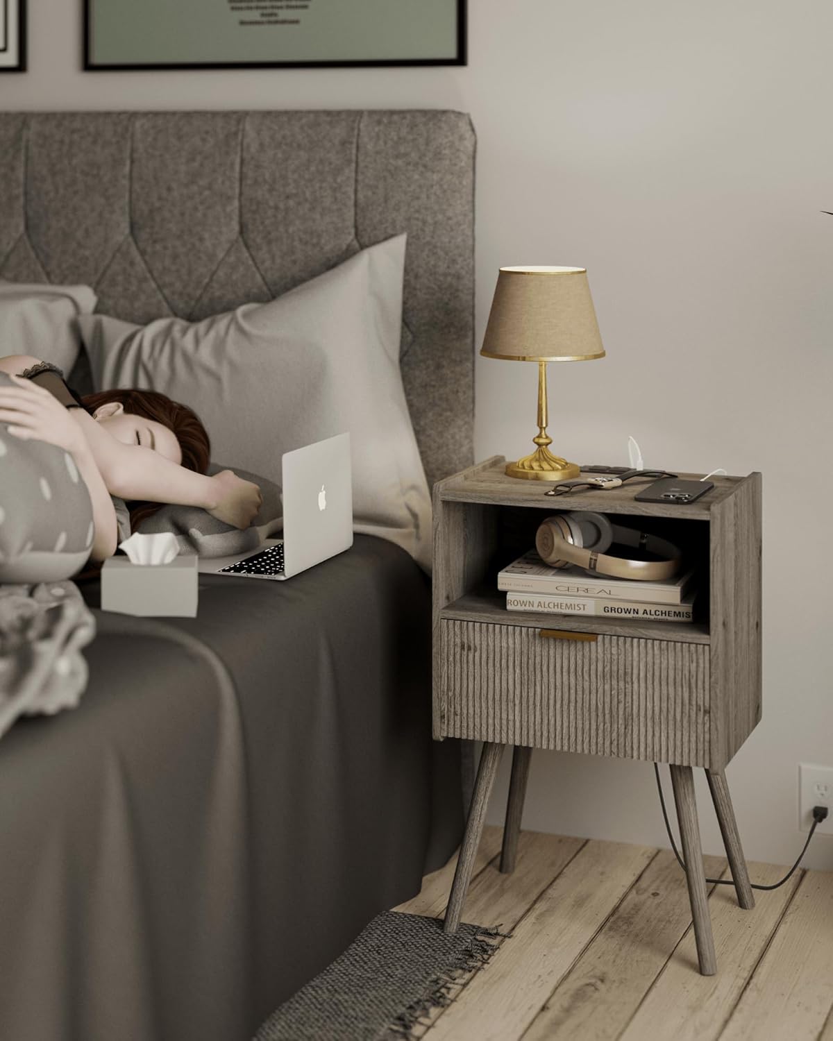 Nightstand with Outlet,Modern Bedside Table with Storage Drawer and Open Wood Shelf, for Living Room, Bedroom and Small Spaces, Accent Night Stand with Solid Wood Legs, Easy Assembly,Grey Oak