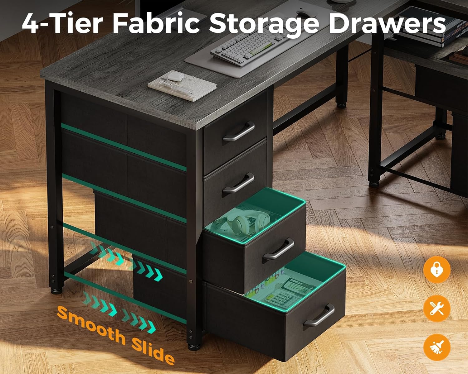 - 【Computer Desk with Drawers & Storage Shelf】The computer desk owns five fabric drawers and one capacious fabric file drawer. You can put your office supplies or gaming equipments in to keep them in order and dust-free. The side storage shelf provides extra storage space for your books.
