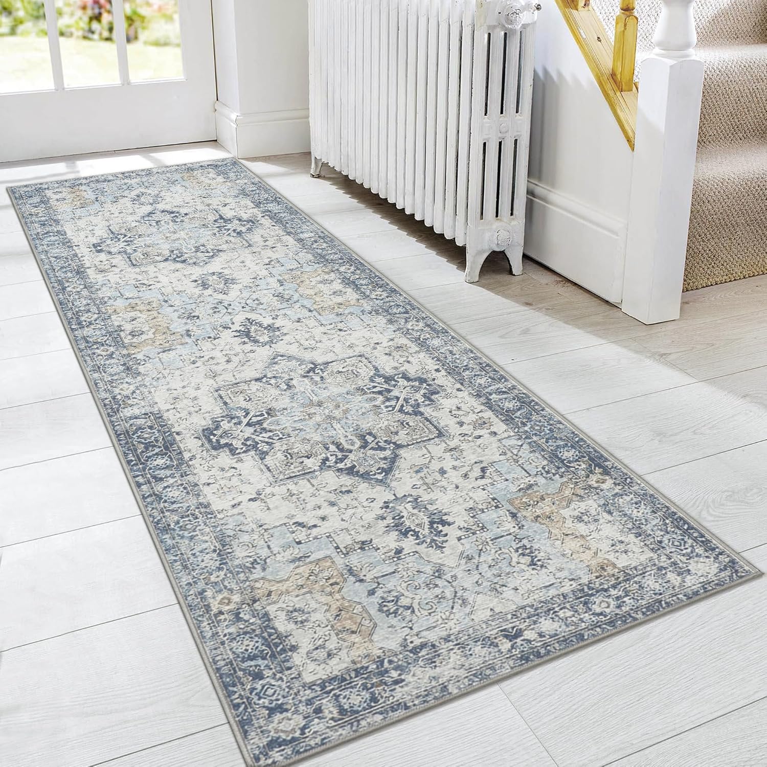 GENIMO Runner Rug 2'6''x8, Non Slip Vintage Hallway Runner Rugs, Low Pile Lightweight Machine Washable Mat for Hallway, Entryway, Bedroom, Kitchen and Corridor, Blue