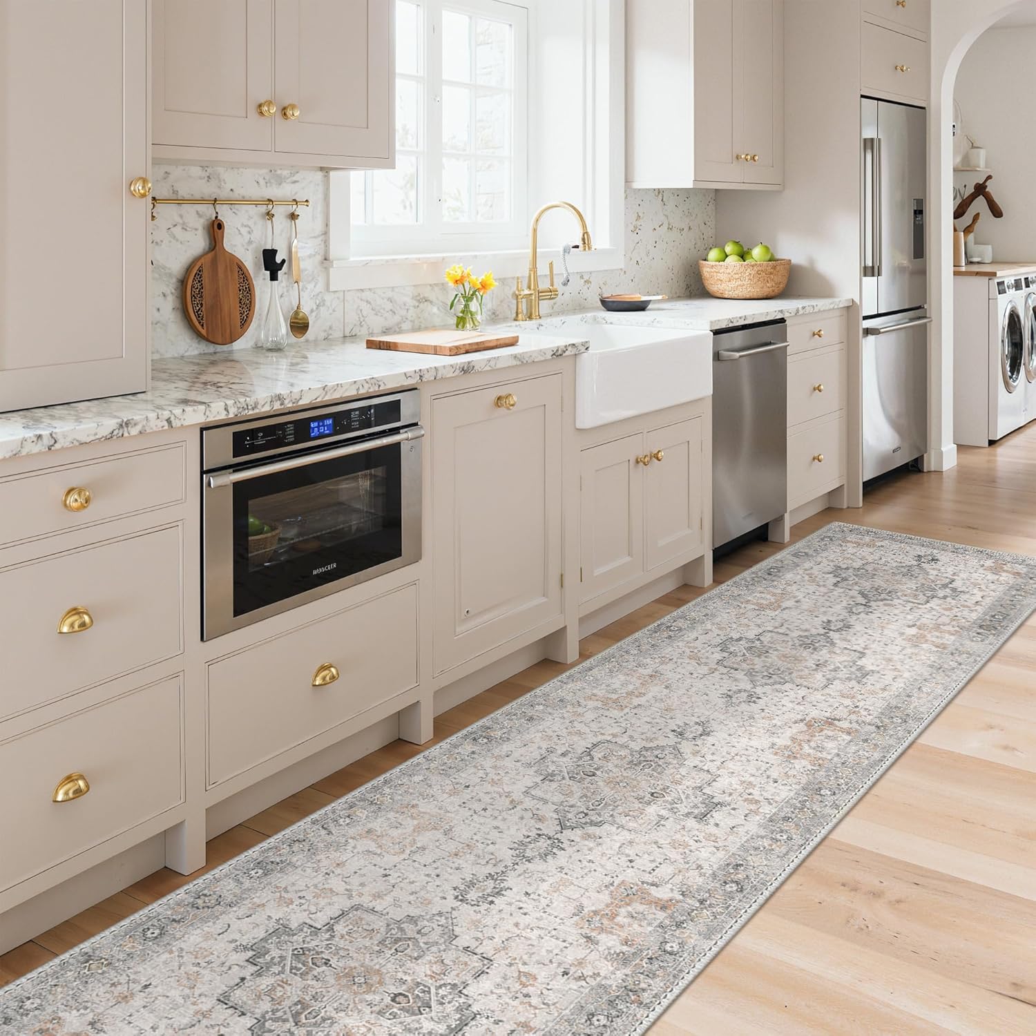 GENIMO Runner Rug 2'6''x8, Non Slip Vintage Hallway Runner Rugs, Low Pile Lightweight Machine Washable Mat for Hallway, Entryway, Bedroom, Kitchen and Corridor, Light Taupe Brown