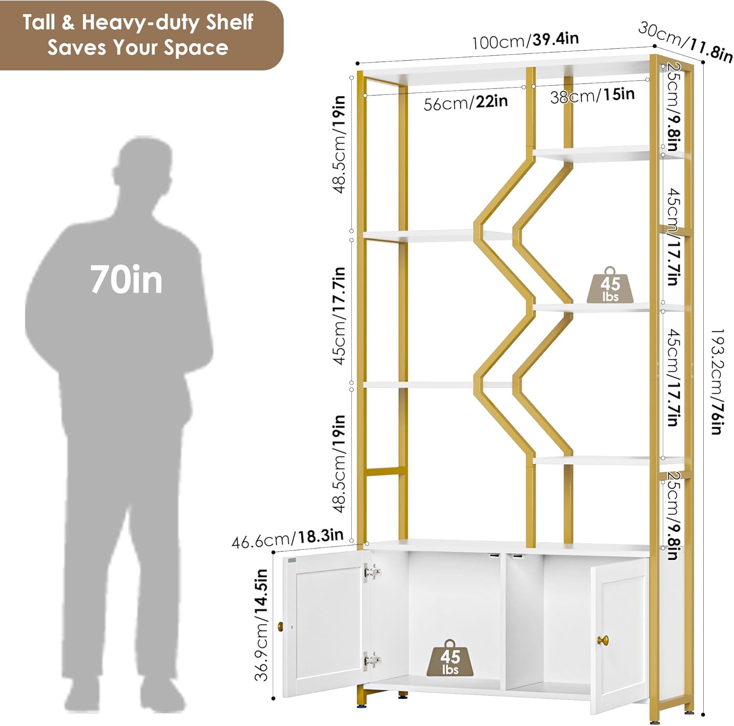- 2 Hidden Cabinets & 6 Different-height Shelves: This multi-use tall shelf can accommodate different-sized items. 2 cabinets with doors can hide your private items or something requiring shading, such as cosmetics and office files. 6 different-height shelves can hold large printers, magazines, books, and more. It can be used as a multifunctional display shelf or bookshelf. In addition, the open design allows for easy access