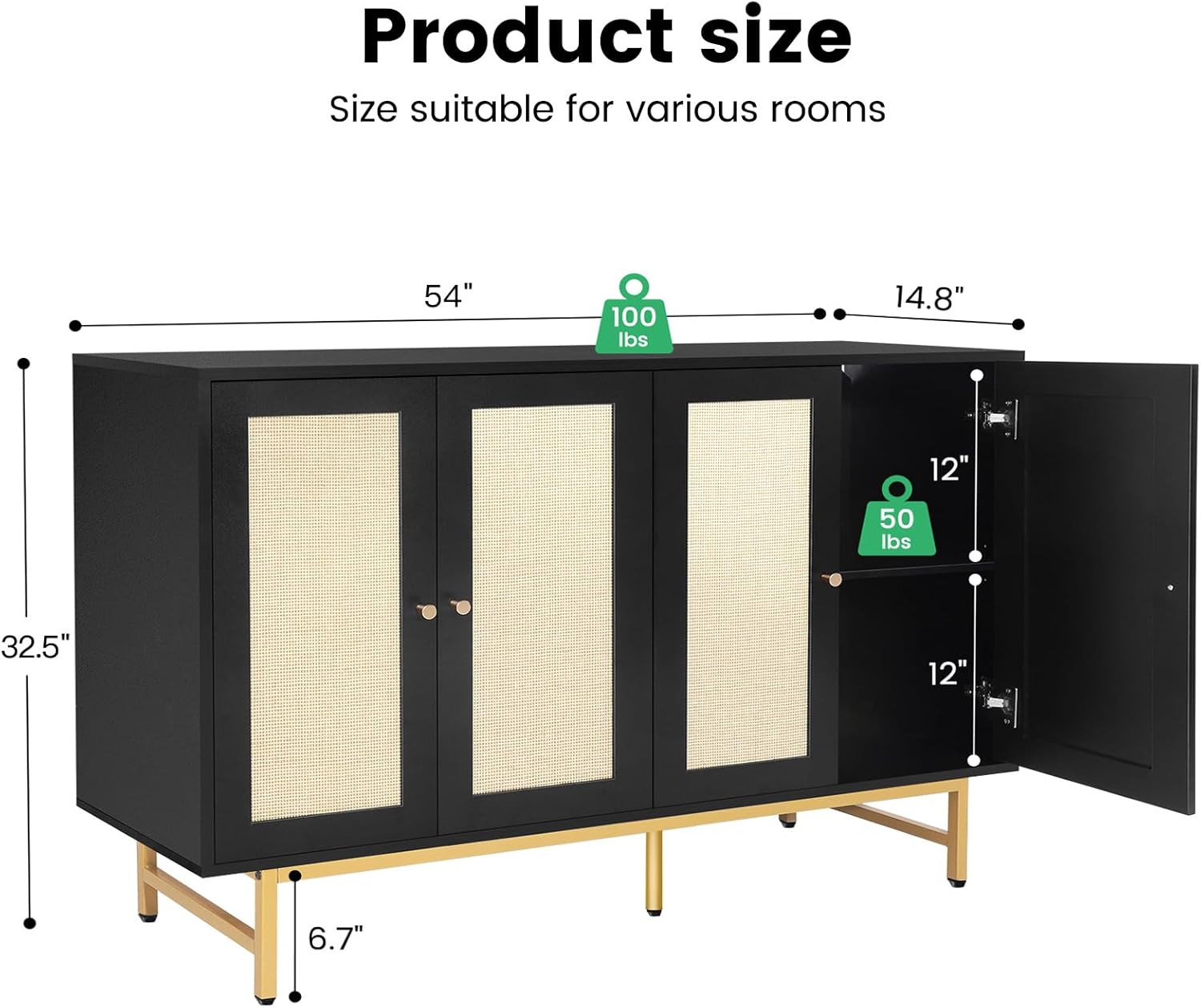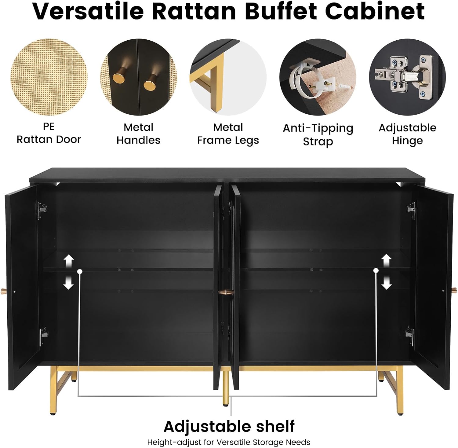 - Ample Storage Space: This rattan cabinet measures 54" L x 15" W x 32.3" H providing large storage space with its four doors, inner shelf and spacious tabletop. The inner shelf can adjust 3 heights allows you to customize the interior space to fit your needs, whether for kitchenware, dining essentials, or decorative items, keeping everything organized and accessible