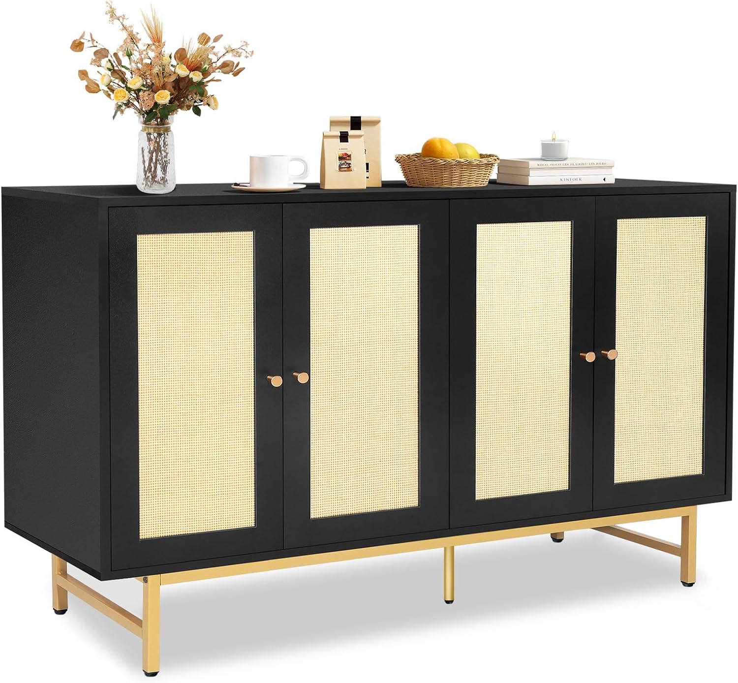 Sideboard Buffets Cabinet with 4 Rattan Doors, Large Storage Accent Cabinet Credenzas Modern Console Table for Living Room, Kitchen (Black)