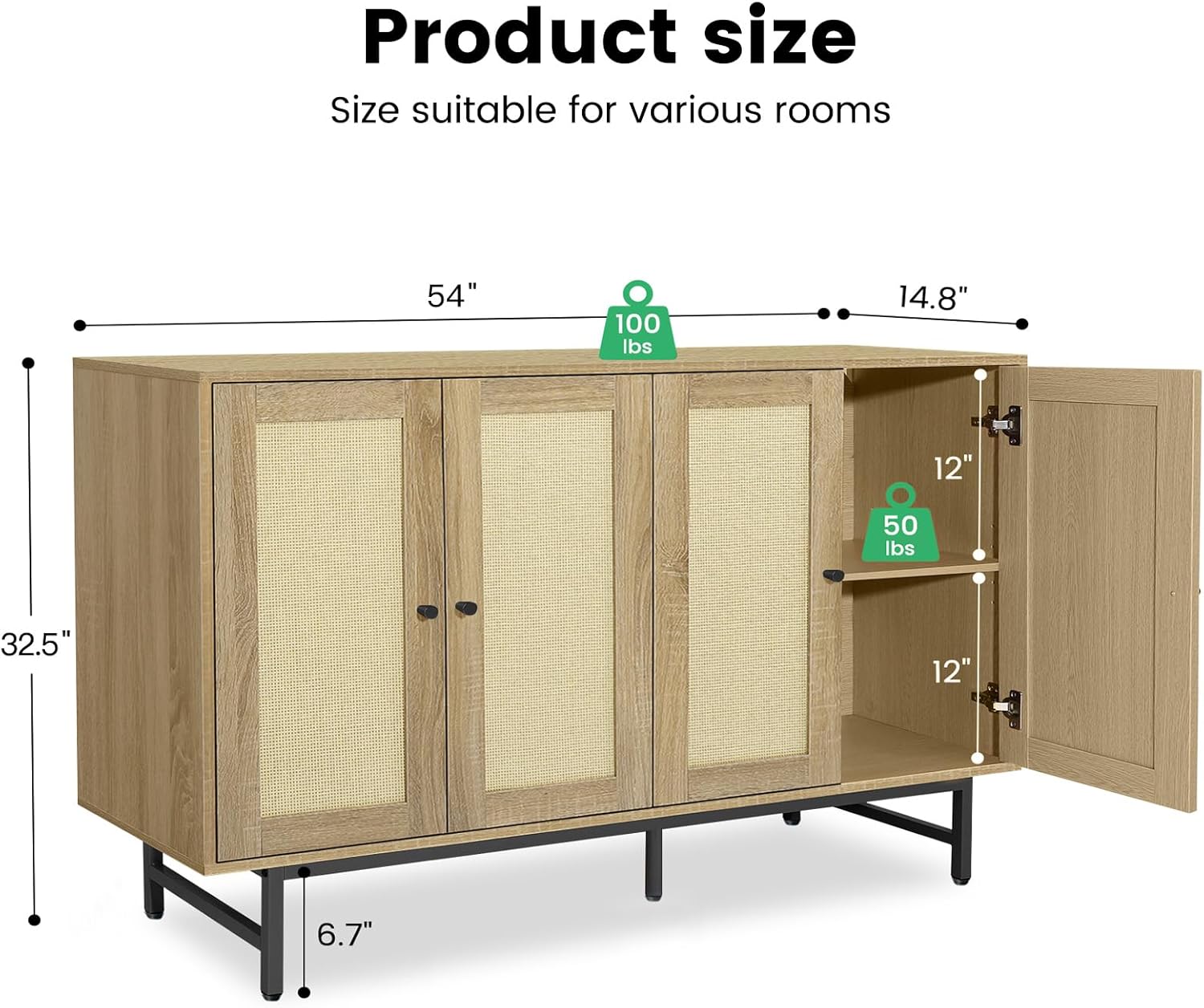 - Ample Storage Space: This rattan cabinet measures 54" L x 15" W x 32.3" H providing large storage space with its four doors, inner shelf and spacious tabletop. The inner shelf can adjust 3 heights allows you to customize the interior space to fit your needs, whether for kitchenware, dining essentials, or decorative items, keeping everything organized and accessible