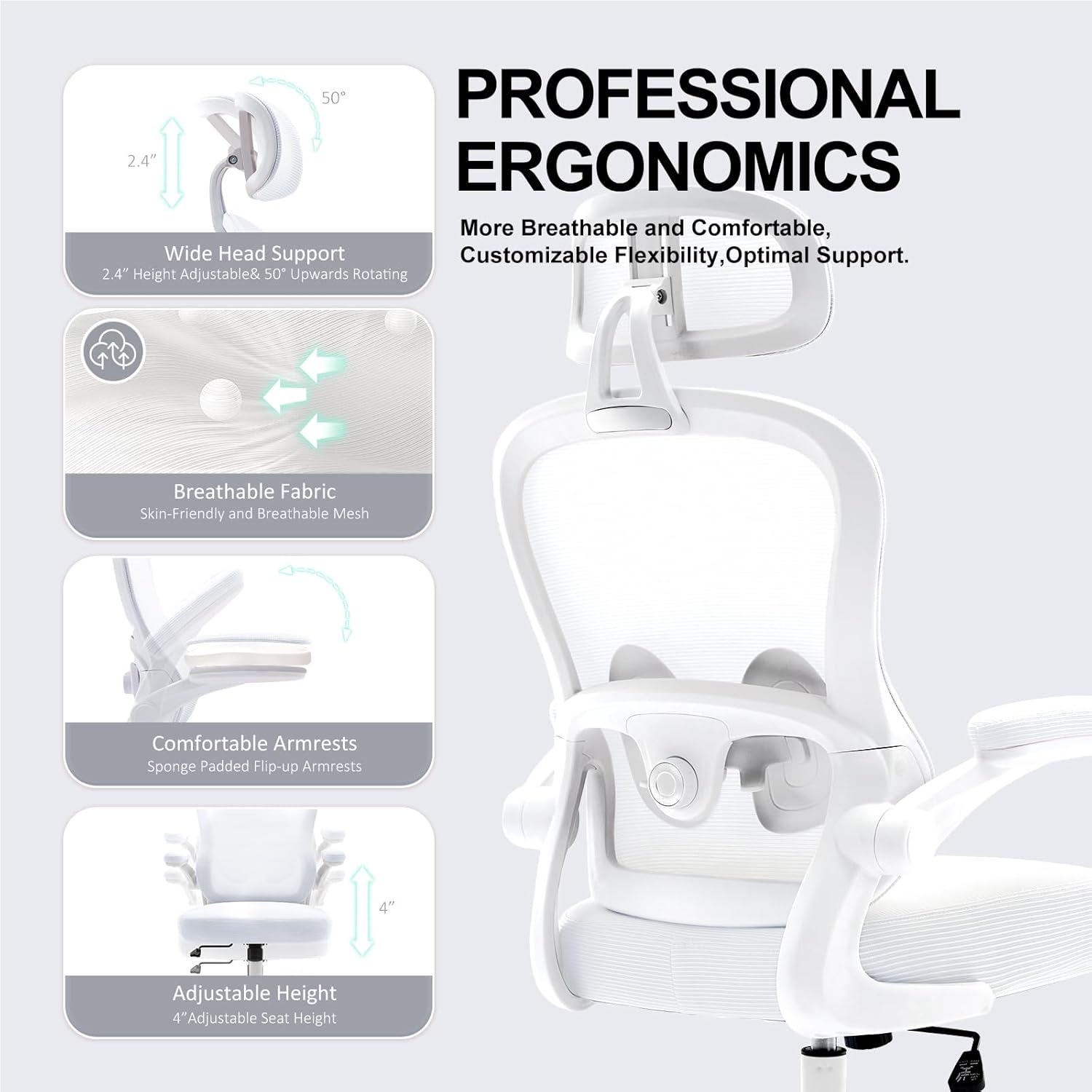 Ergonomic Office Chair,Ultra Thick Office Desk Chair with Adjustable Lumbar Support and Headrest,Spring Cushion,Rocking Function,Flip-up arms,Mesh Computer Chair for Home Office,White