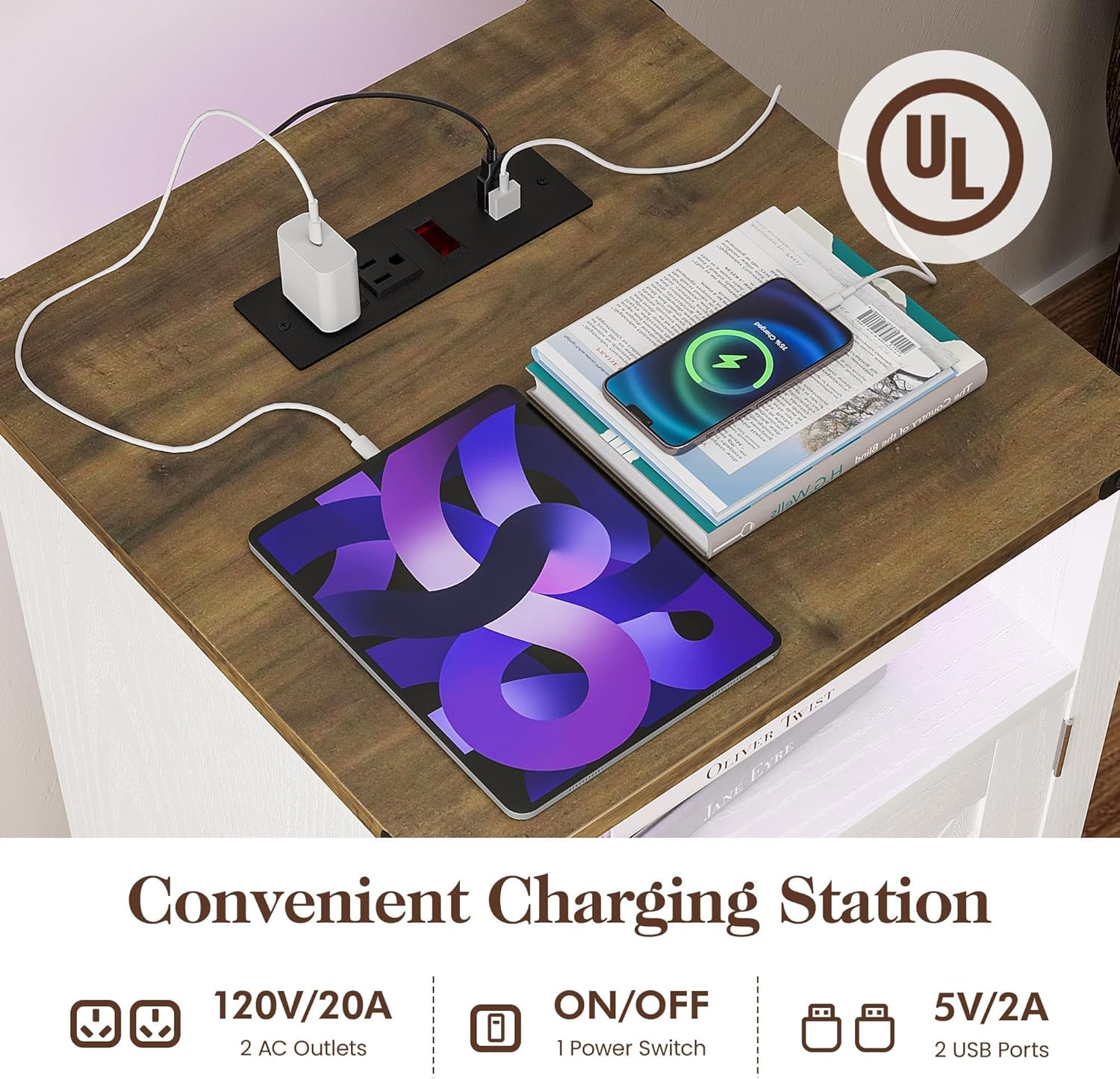 - Nightstand with Charging Station Set of 2: This end table is equipped with 1 Power Switch, 2 Standard AC outlets, 2 USB ports, and a 6.6-foot cord, which ensures it can be charged up to four electronic devices at the same time. It is very convenient for you to keep your mobile phone, ipad and Labtop within reach when charging. No more searching for outlets or dealing with a tangle of cords.