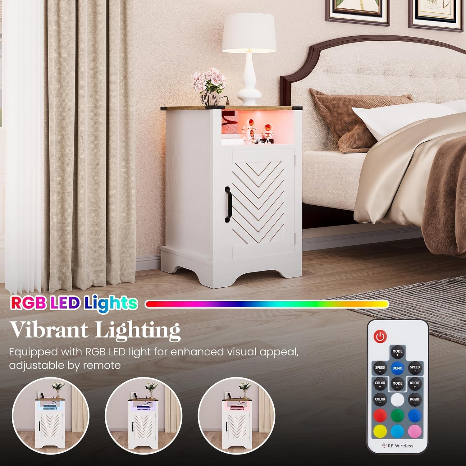 - Farmhouse Nightstand with LED Light: X-shaped barn door, beautiful colors combined with a metallic design, making the whole end table chic and aesthetic, specifically for you who like farmhouse style. The vibrant lighting design of the Nightstand (7 dynamic modes, brightness adjustment, and dynamic gradient effect) adds a cozy and stylish dreamy vibe to your bedroom decor. The bedside table/night stand also doubles as a night light, helping you conquer your fear of the dark.