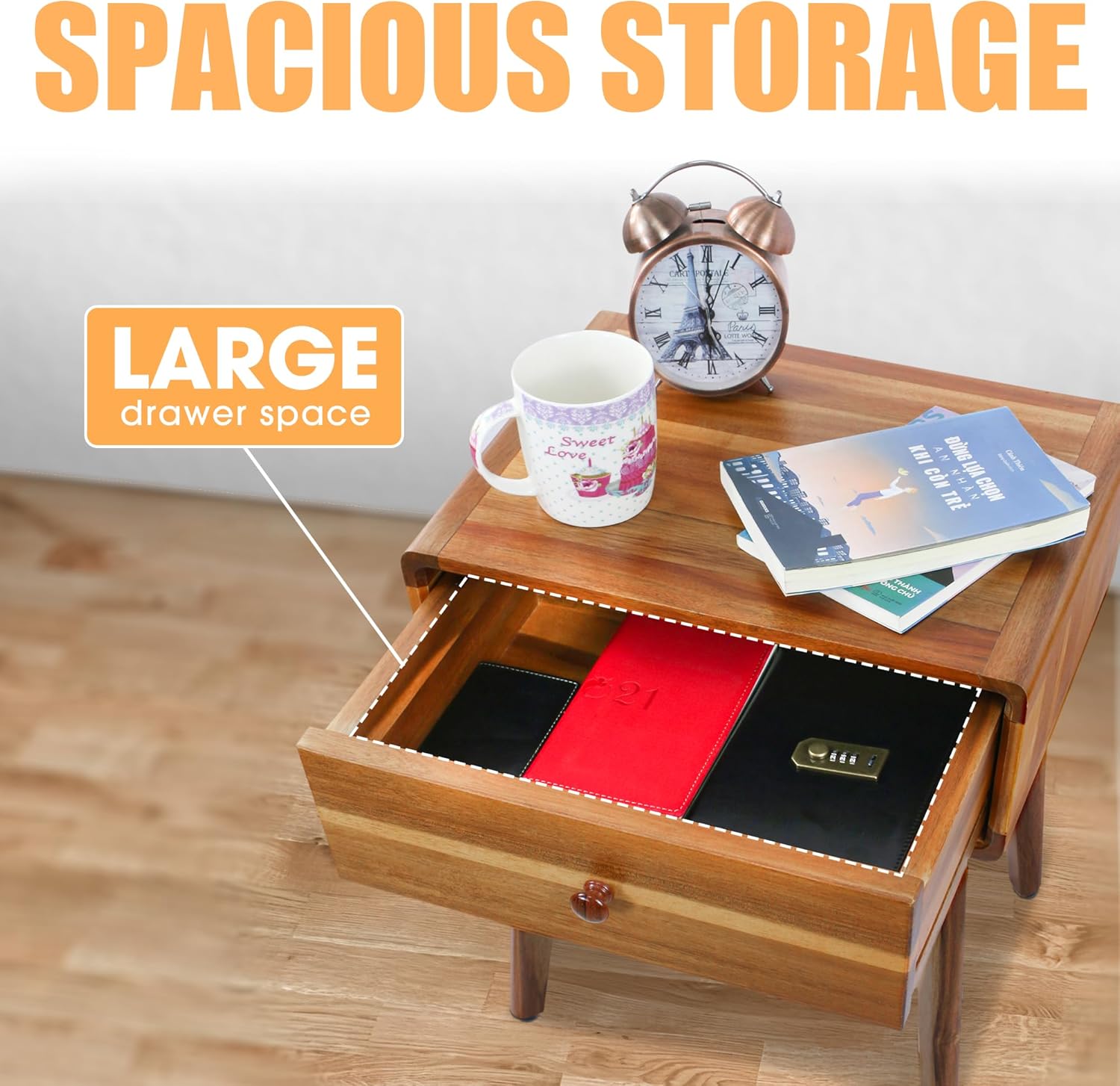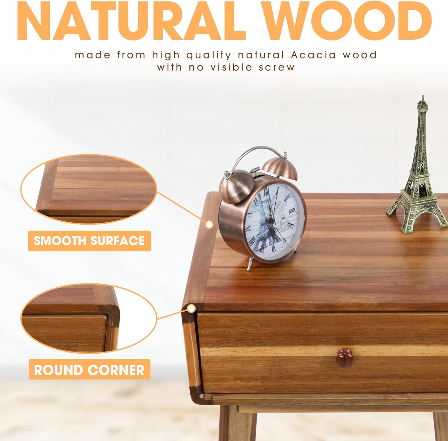 ENKEZI Small Mid Century Acacia Night Stand with Drawer Dresser, Handcrafted Small Nightstand, Space-Saving Bedroom Side Tables with Acrylic Coating, No Visible Nails