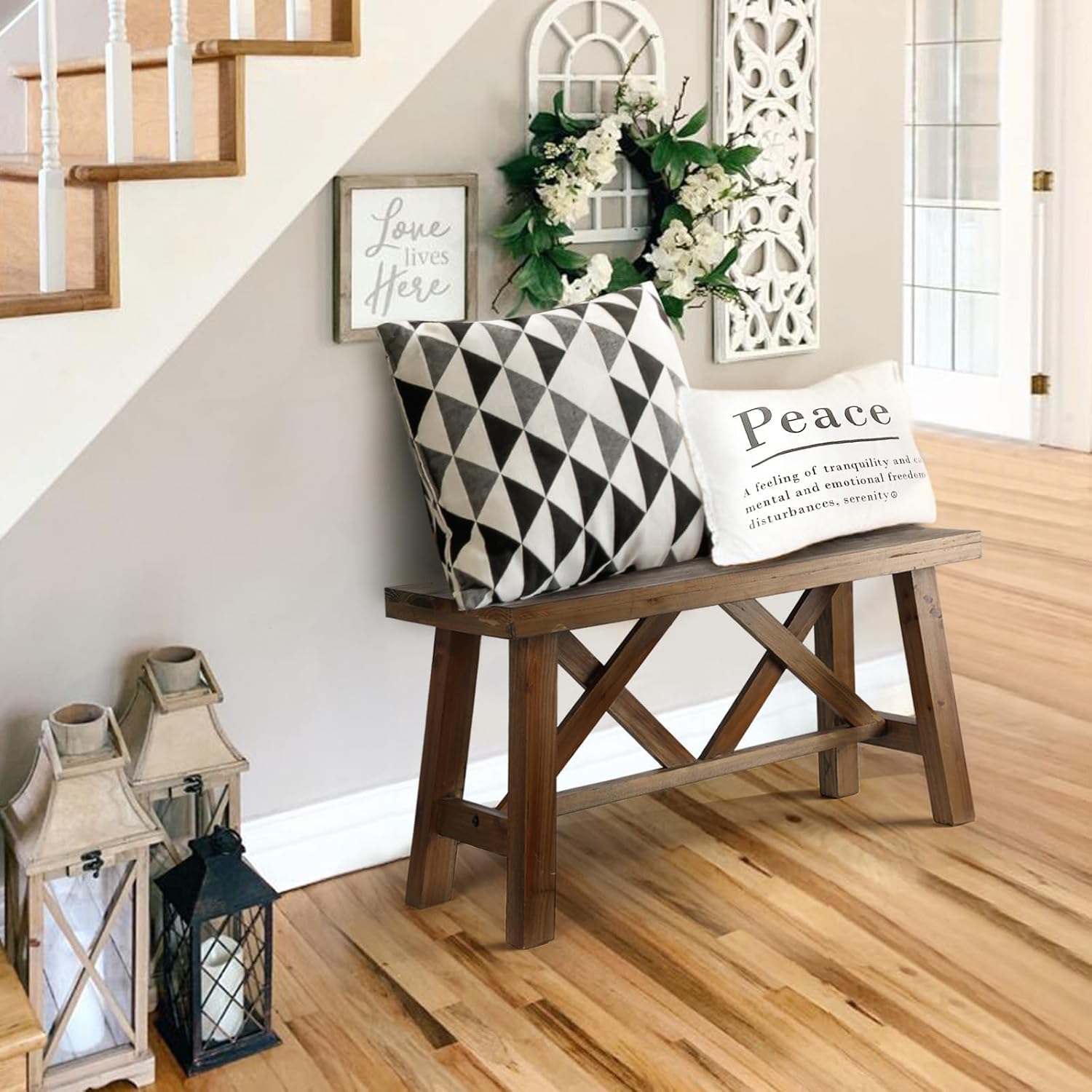 - 【Small Wood Bench】This wooden bench seat has Double X-Structure farmhouse design that can be amplified by cushion pillows and woven fabric. So take a load off and relax on this decorative bench. A small piece of furniture that make a big difference to give your home an instance refresh