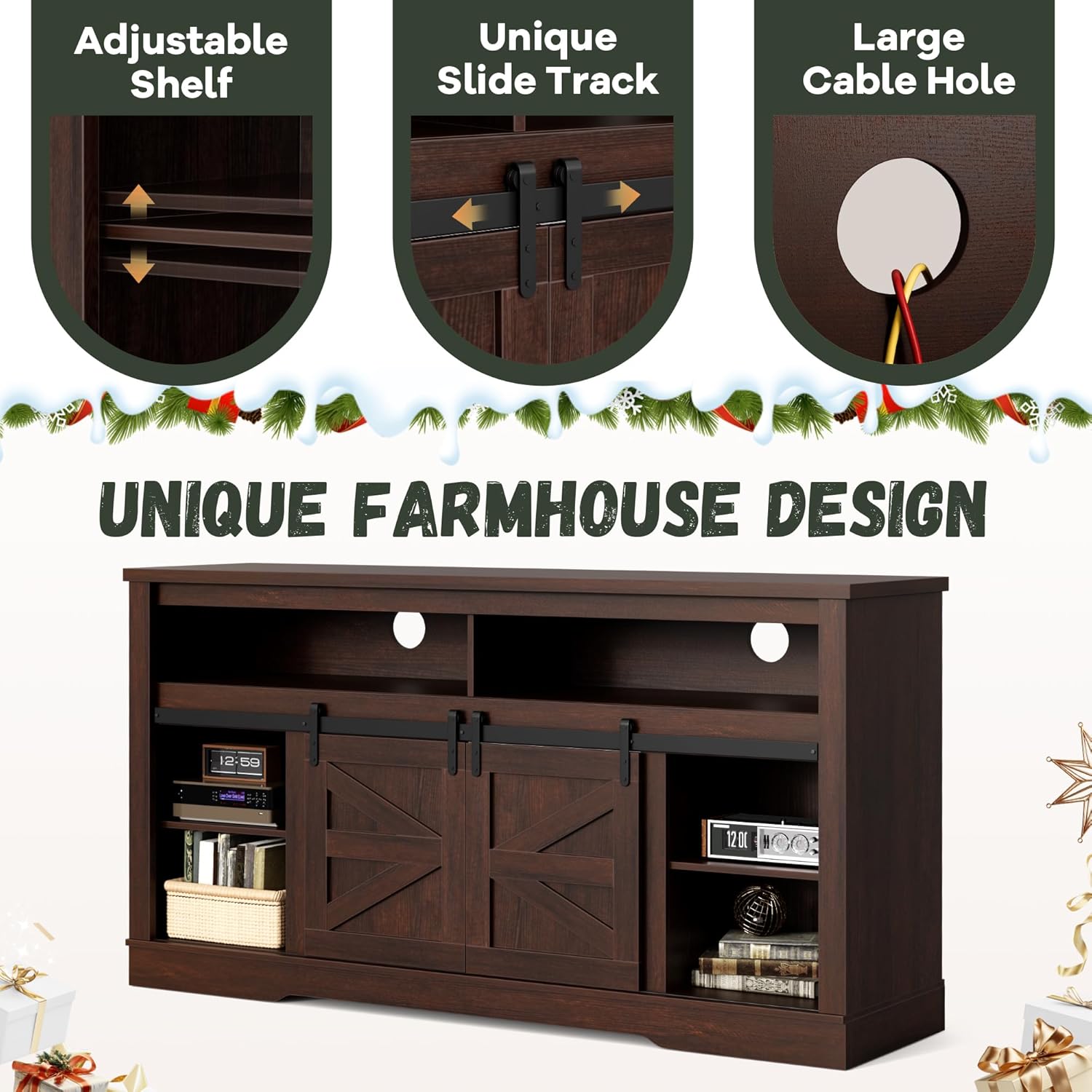 - Sliding Barn Door: The TV stand is equipped with two removable sliding barn doors, which makes it look nice. And compared to drawer design, sliding design are more convenient.