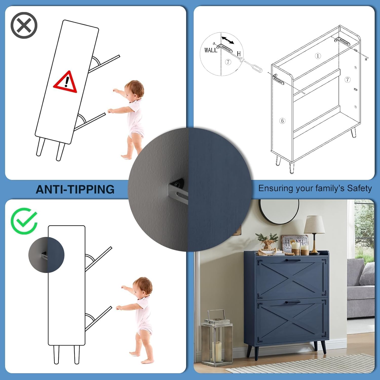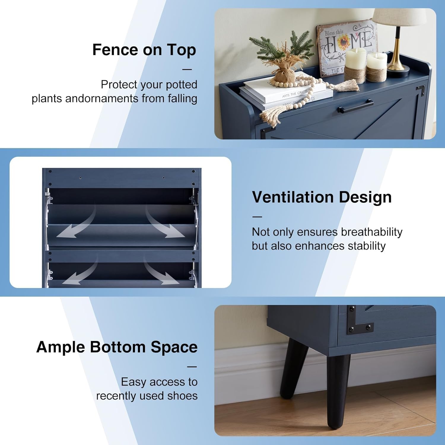 Shoe Storage Cabinet,Farmhouse Shoe Organizer with 2 Flip Drawers & Barn Door Design,Freestanding Hidden Slim Narrow Shoe Rack Cabinet for Entryway,Foyer,Hallway,Blue
