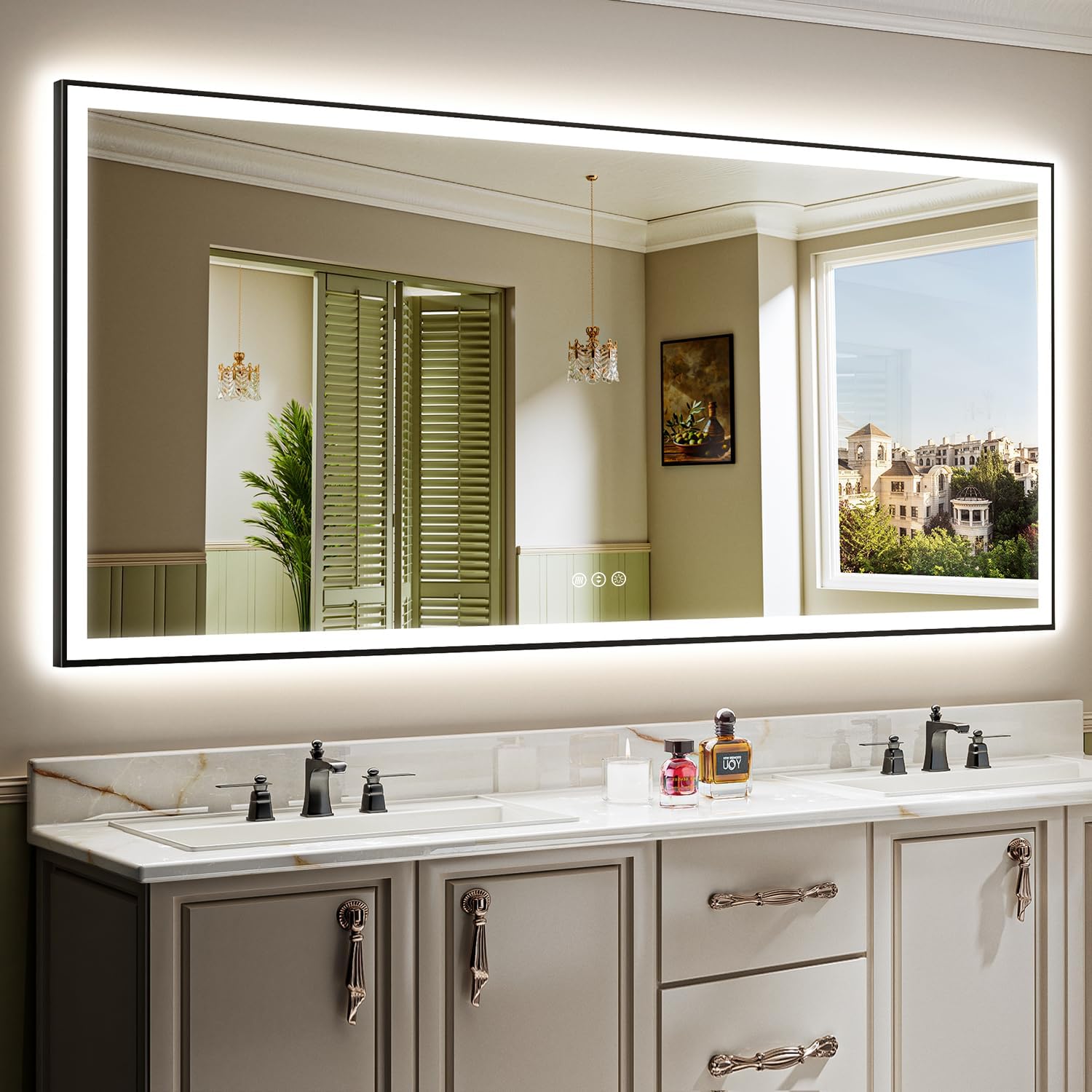 - 🔆【Backlit+Front Lit & Black Frame】- Designed with double lighting, our Led mirror for bathroom is twice or more brighter than ordinary lighted bathroom mirror. Bright enough for makeup, shaving or beauty care. The modern look of black frame is perfect for you to remodel and upgrade bathroom.