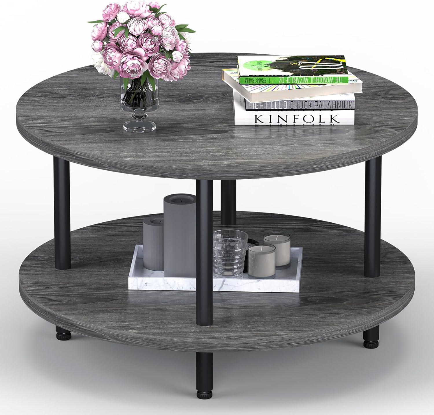 Coffee Table, 2 Tier Coffee Tables for Living Room, Round Coffee Table with Storage, Floor Table for Bedroom, Home Office, Grey (23.6" D x 18.1" H)