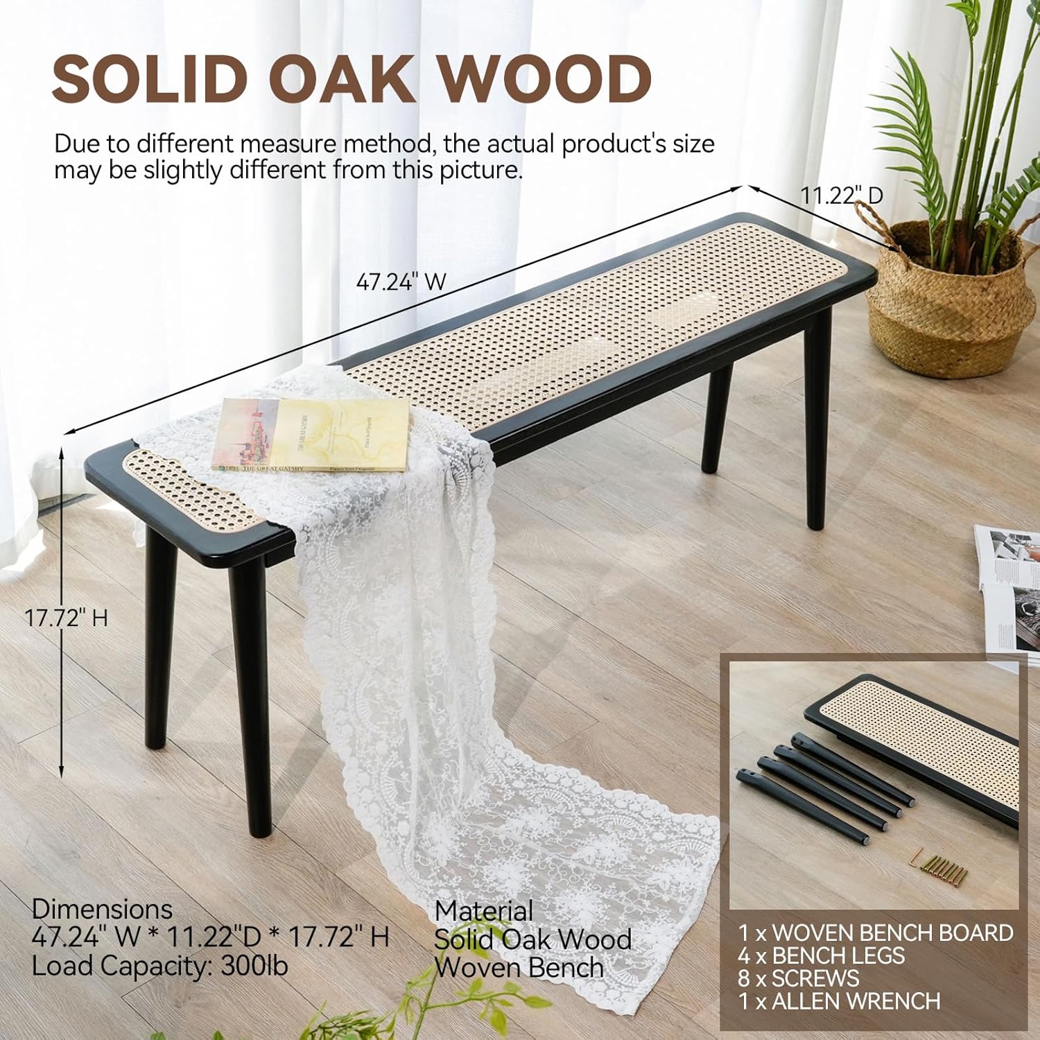 Entryway Bench, Solid Wood Kitchen Dining Bench, Mid Century Modern End of Bed Bench with Rattan Woven Top for Bedroom, Dining Room, Entry Way, 47.2" L x 11.2" W x 17.7" H, Black