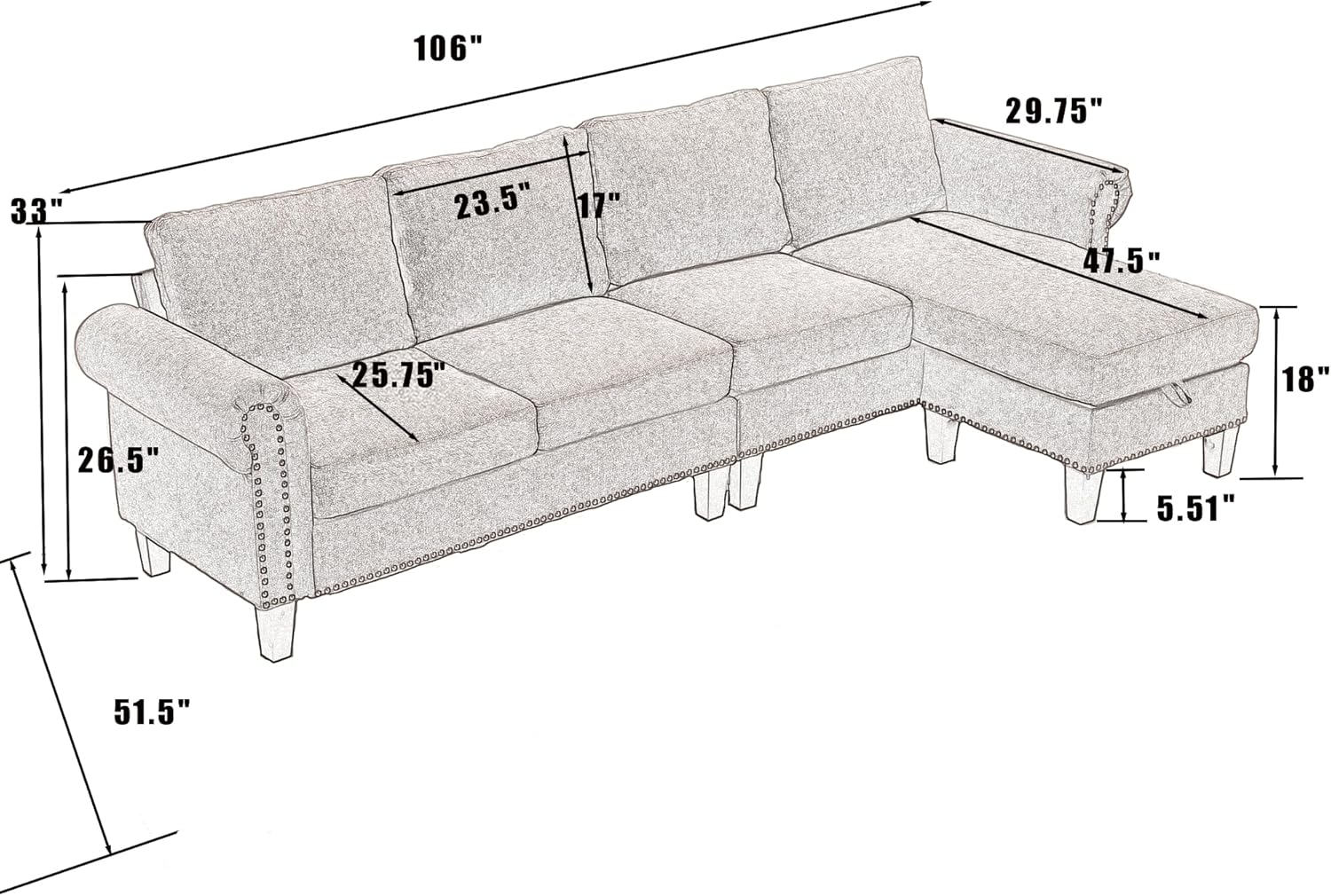 Ball & Cast 106" Convertible Sectional Sofa with Storage Chaise, Linen Upholstered 4 Seater Couch with Back Cushions and Removable Ottoman for Living Room, Apartment, Office,Beige